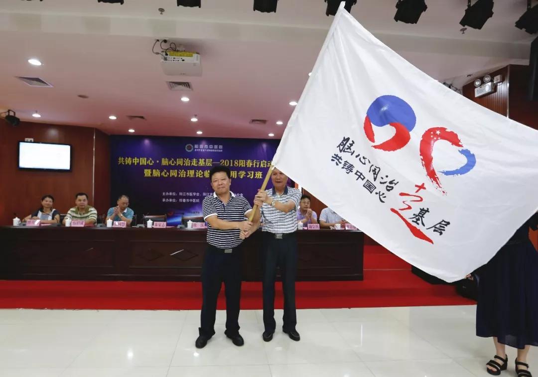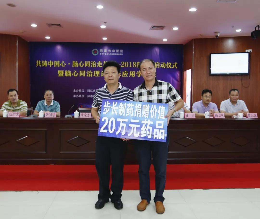会上,我院朱家志副院长首先致辞,他向参加本次公益活动的专家及嘉宾表示诚挚的感谢和热烈的欢迎,他表示,我院会借此机会提供更高水平的技术和更优质的服务,全方位、全周期保障阳春人民的健康。文学主委在会上也表示,阳江市医学会脑心同治分会将在活动中培训基层医师先进的诊疗技术,同时提高当地群众防病治病意识,为阳春市心脑血管病的发病率、致残率和致死率的降低做贡献。接下来是活动的授旗仪式,杜派会长代表阳江市医学会为朱家志副院长进行了“共铸中国心.脑心同治走基层”授旗仪式。授旗仪式后,文学主任委员和朱家志副院长进行了药品捐赠仪式;本次步长公司共捐赠药品价值人民币20万元,捐赠的药品会在接下来的活动中分发给阳春的基层群众,希望可以减轻患者疾病痛苦,提升人民生活质量。