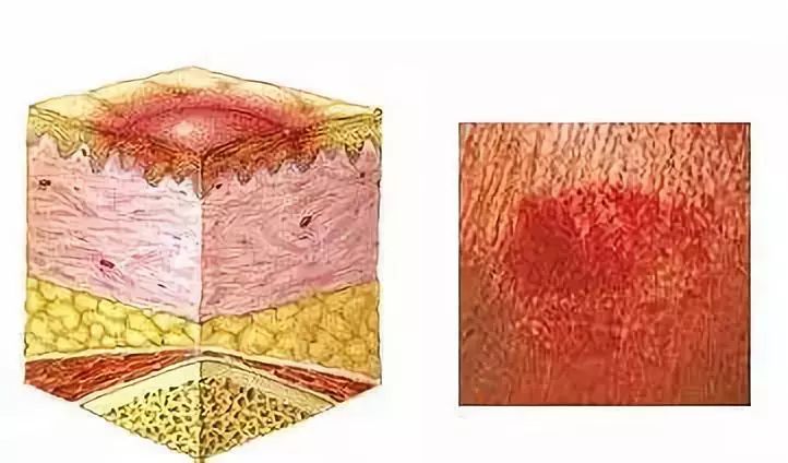 根据褥疮症状及病理,可将褥疮分为6种。①可疑的深部组织损伤皮下软组织受到压力或剪切力的损害,局部皮肤完整但可出现颜色改变如紫色或褐红色,或导致充血的水疱。与周围组织比较,这些受损区域的软组织可能有疼痛、硬块、有黏糊状的渗出、潮湿、发热或冰冷。②第一期压疮淤血红润期,表现为“红、肿、热、痛或麻木,持续30分钟不褪”在骨隆突处的皮肤完整伴有压之不褪色的局限性红斑。深色皮肤可能无明显的苍白改变,但其颜色可能与周围组织不同。