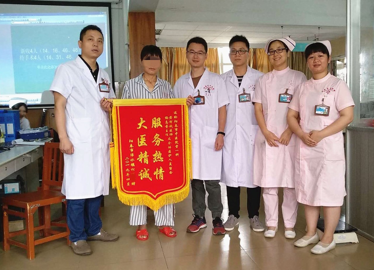 第二个送锦旗的患者,吴某夫妇两人,去年12月份在罗定市因车祸导致多发伤,病情重。吴某小腿开放性骨折,其妻子大腿及小腿均为开放性骨折。伤后送至罗定市某医院治疗,后因患者听闻我院骨伤科技术好,遂转来我院创伤一科治疗。 创伤一科杨志芬主任和科室医师经过讨论,为他们制定了最佳的治疗方案,手术后患肢功能恢复理想,患者术后3个月可完全负重下地行走,吴某夫妇两人对治疗效果及创伤一科全体医护人员优质的服务表示感激。特送来锦旗以感谢创伤一科全体医护人员!