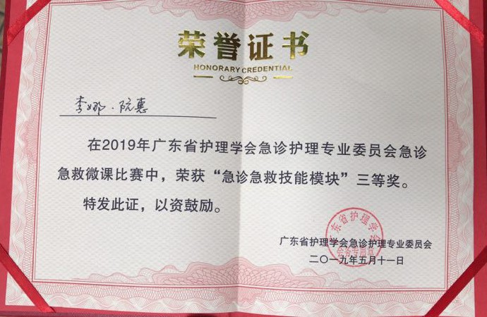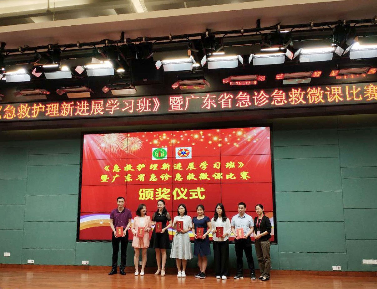 为切实提高急诊医护人员的急救水平,规范急救操作,增强急救意识以及应急能力,加强急诊急救质量与内涵建设,5月11日,由广东省护理学会急诊护理专业委员会主办的全国急诊急救微课广东赛区选拔赛圆满落幕。经过激烈的角逐。我院李娜、阮惠同志组成的代表队在比赛中荣获“急诊急救技能模块”三等奖。