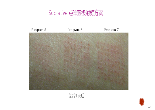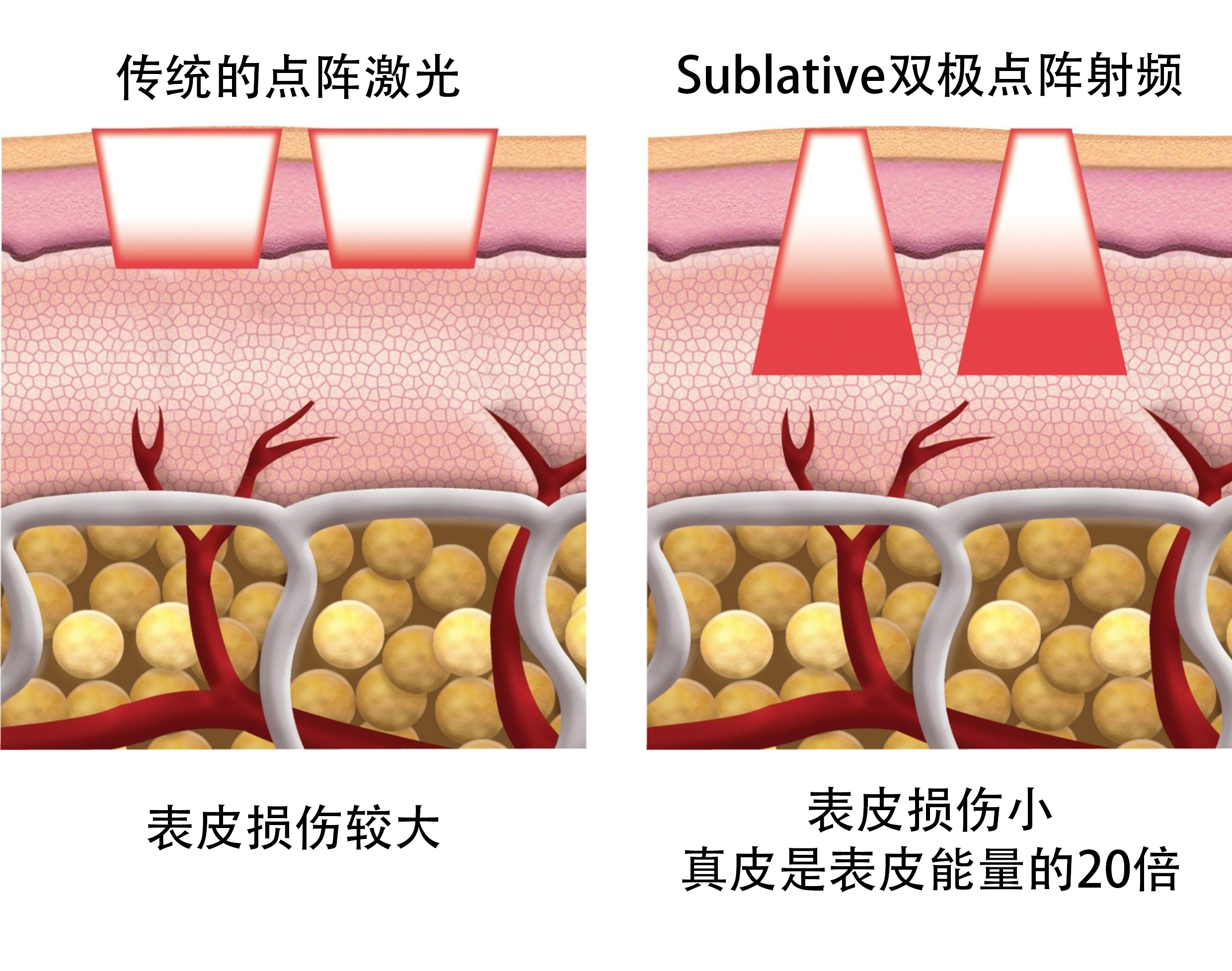以点阵模式在正负极间释放射频能量的双极射频技术,通过专利设计的治疗头上多组平行矩阵点在皮肤表面形成微米孔径,将射频能力通过这些孔径传递到皮肤深层,气化皮肤表层的同时,加热皮肤深层,激活胶原新生和重建,从而到达改善瘢痕、缩小毛孔、嫩肤、祛皱目的的一种技术。