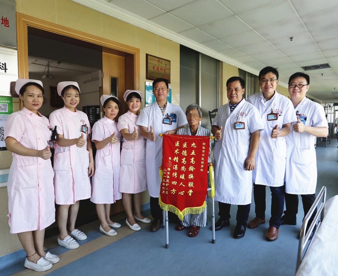 近日,阳春市中医院骨二科成功为一名95岁老人黎奶奶施行了人工股骨头置换手术,术后第2天患者能拄着助行器站起来行走,这让家人激动不已。老人的家属为骨二科送来了一面锦旗,称赞医务人员医术精湛、医德高尚。