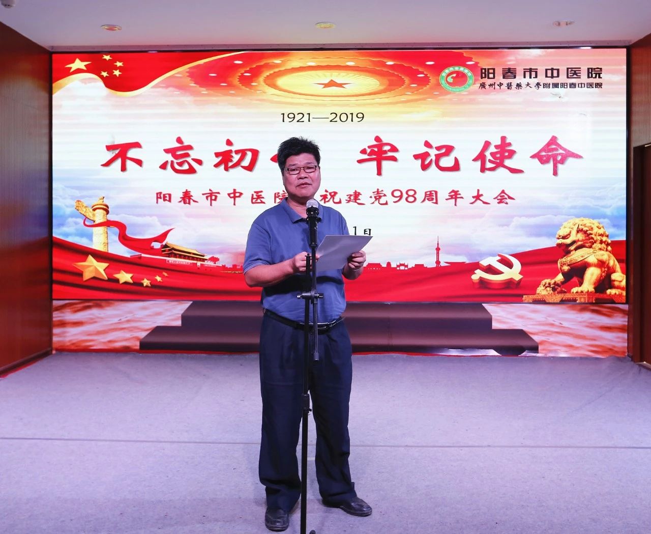大会在开场舞《盛世鼓舞》中拉开序幕。在美轮美奂的灯光下,一场场优美的舞蹈,一曲曲嘹亮的歌声,为中国共产党98周年的到来而热情讴歌。接着,院党总支书记、院长陈永雄在会上致辞,向医院全体党员致以节日的问候。他表示,过去的一年,在市委市政府和市卫健局党委的坚强领导下,我院党总支有效提高了党建工作科学化、制度化、规范化水平;医院医联体建设、重点专科建设、人才培养、新技术应用、医疗服务能力提升、优质护理服务等工作取得了可喜的成绩,医院各项业务得到快速发展。市卫健局党委书记、副局长梁本诚也表示市中医院党总支团结带领全体党员干部和员工,紧跟新时代发展步伐,干事创业,创先争优,广大党员立足岗位,热情不断高涨,诊疗服务水平不断提升,党员的先锋模范作用进一步增强,全院各项工作取得了可喜的成绩。随后,与会党员在陈永雄的带领下,举起右手,面对党旗,齐声宣誓:“我志愿加入中国共产党,拥护党的纲领,遵守党的章程……”一字一句,铿锵坚定,撼动人心,表达了为党的事业奋斗终身的决心和愿望。