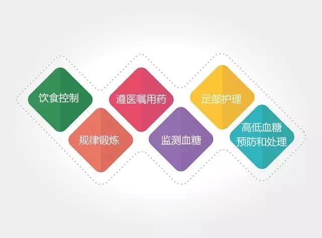 1.注重包括饮食控制、规律锻炼、遵医嘱用药、监测血糖、足部护理以及高低血糖预防和处理等六方面的自我管理;