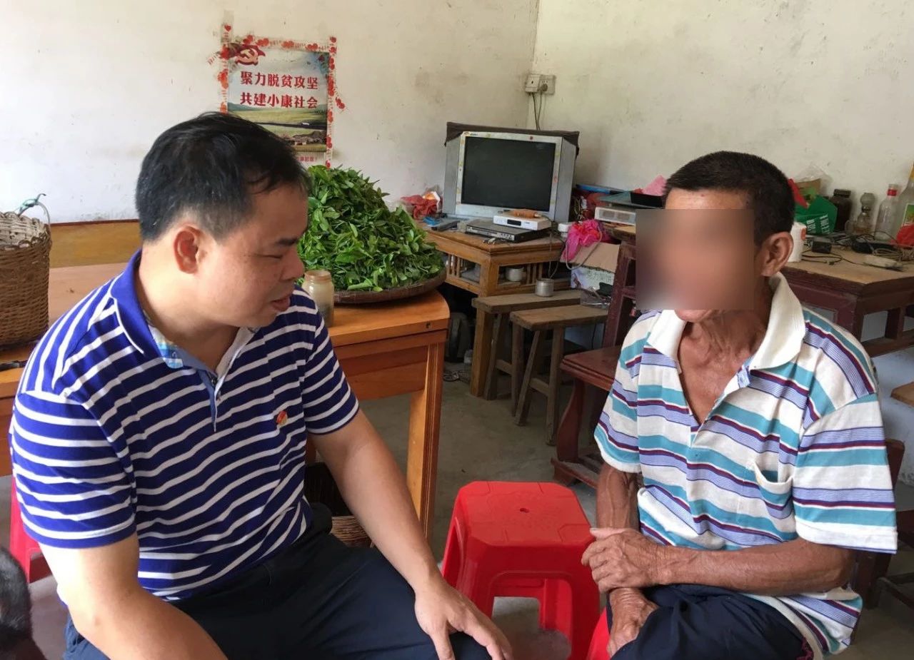 ▲扶贫工作组成员、医务部主任谢文强与贫困户交谈