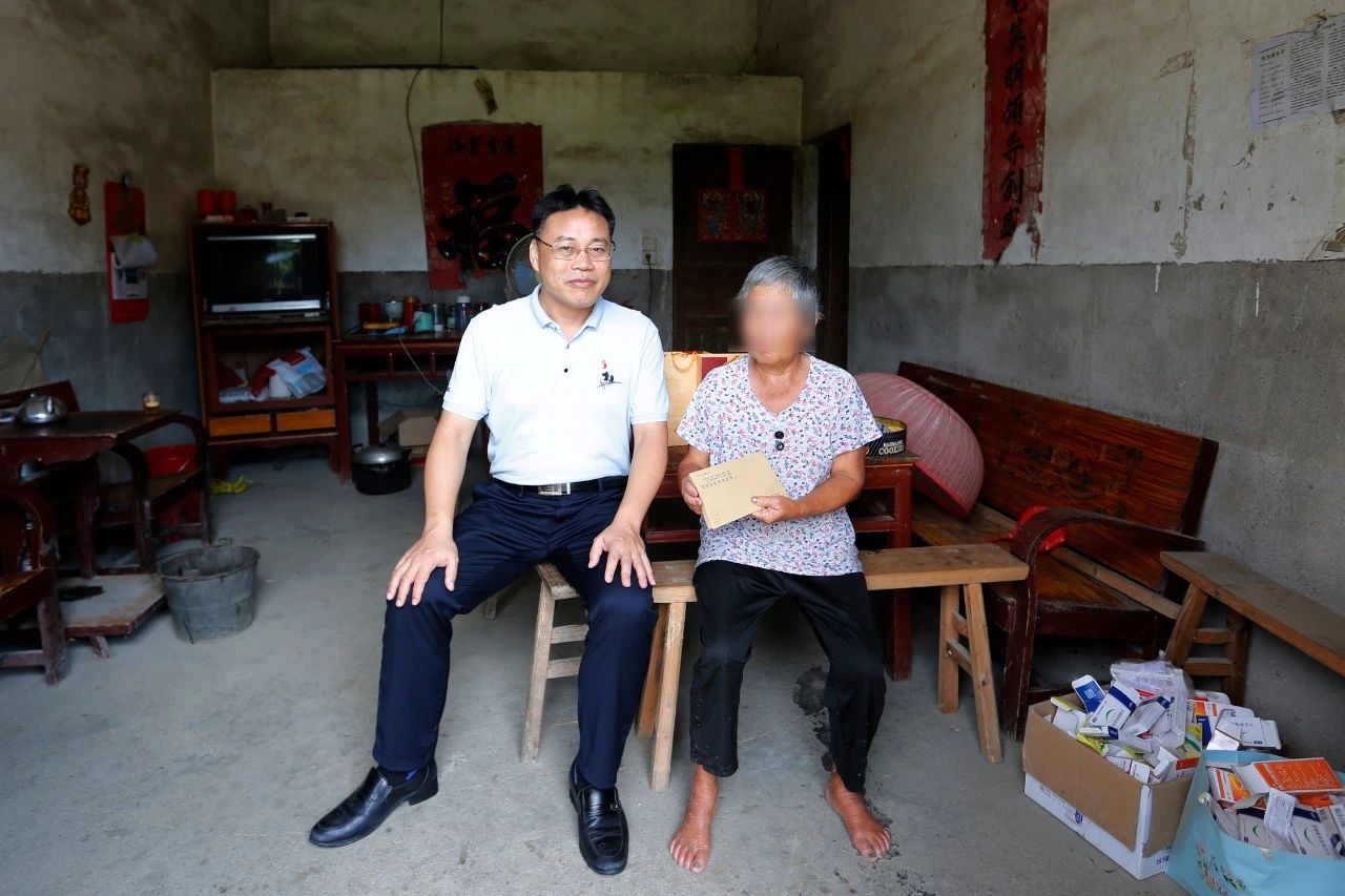 ▲扶贫工作组成员、财务部副主任、医保科兼病案管理科主任严承泽为贫困户送来月饼与慰问金