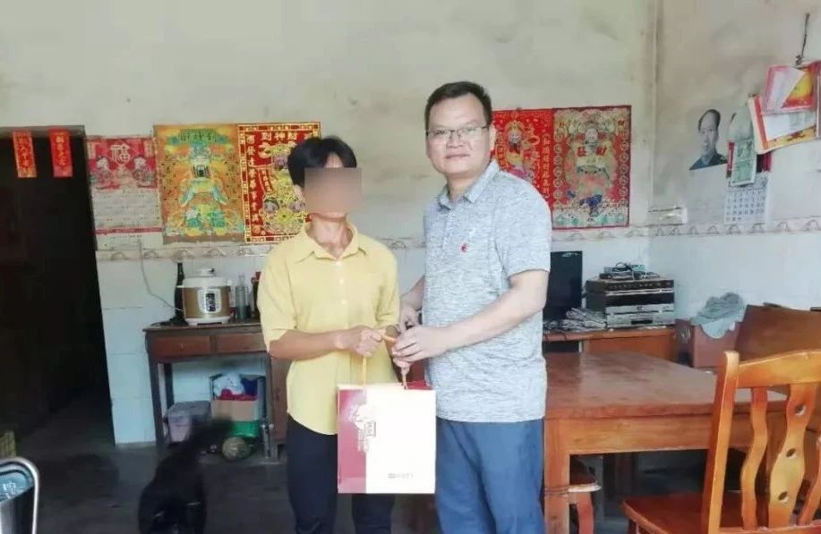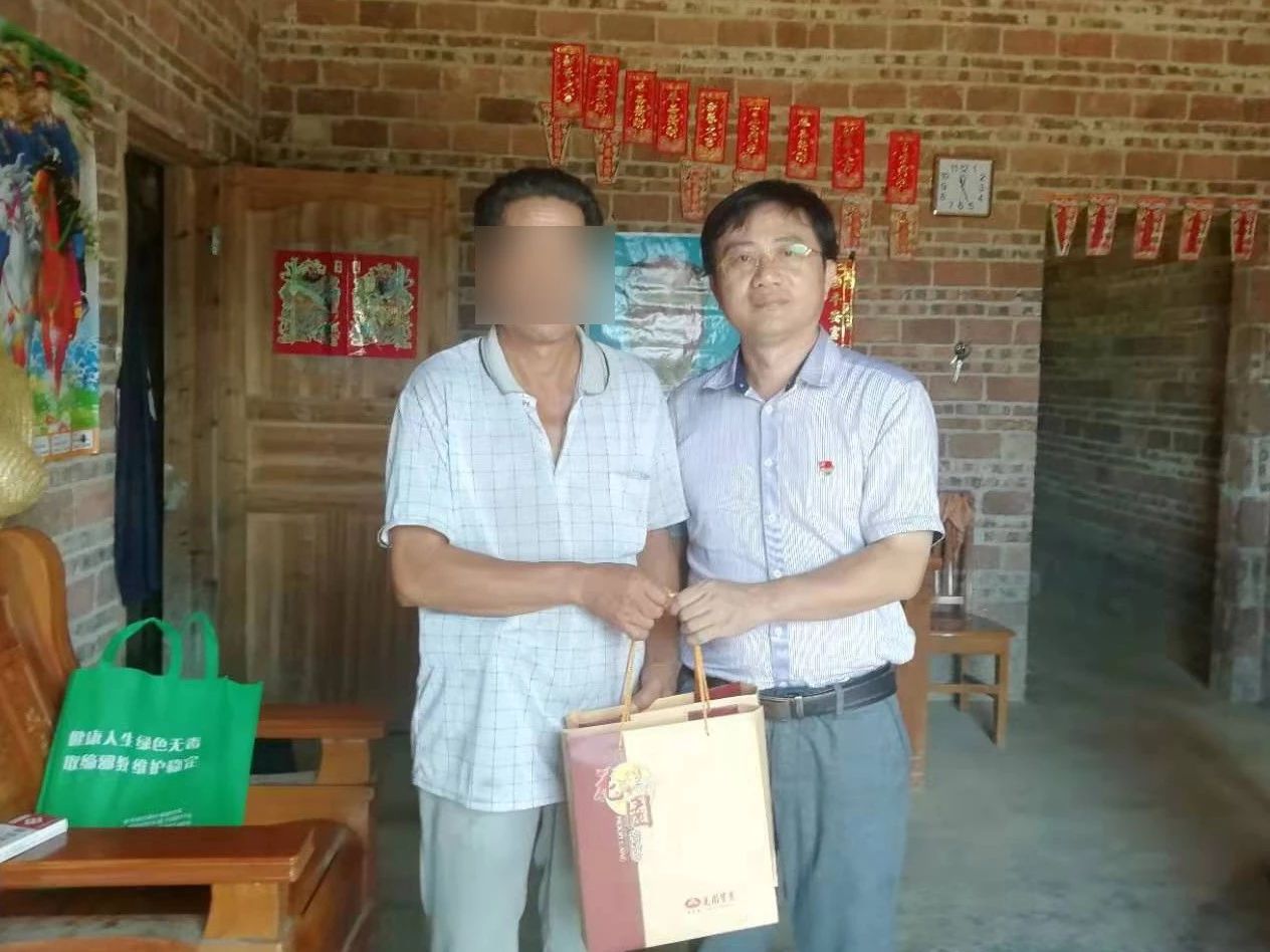 ▲扶贫工作组成员、副院长谢日升为贫困户送来月饼与慰问金