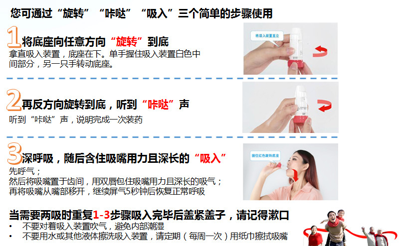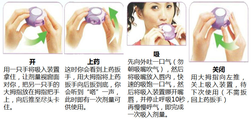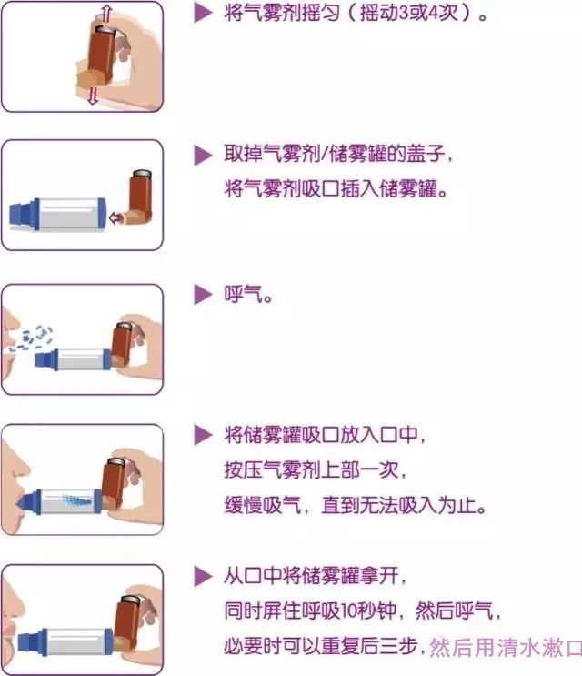 ②对于初始使用定量吸入装置患者、小孩、老人,往往很难有效地把药物吸入肺,这时可配合使用储雾罐。