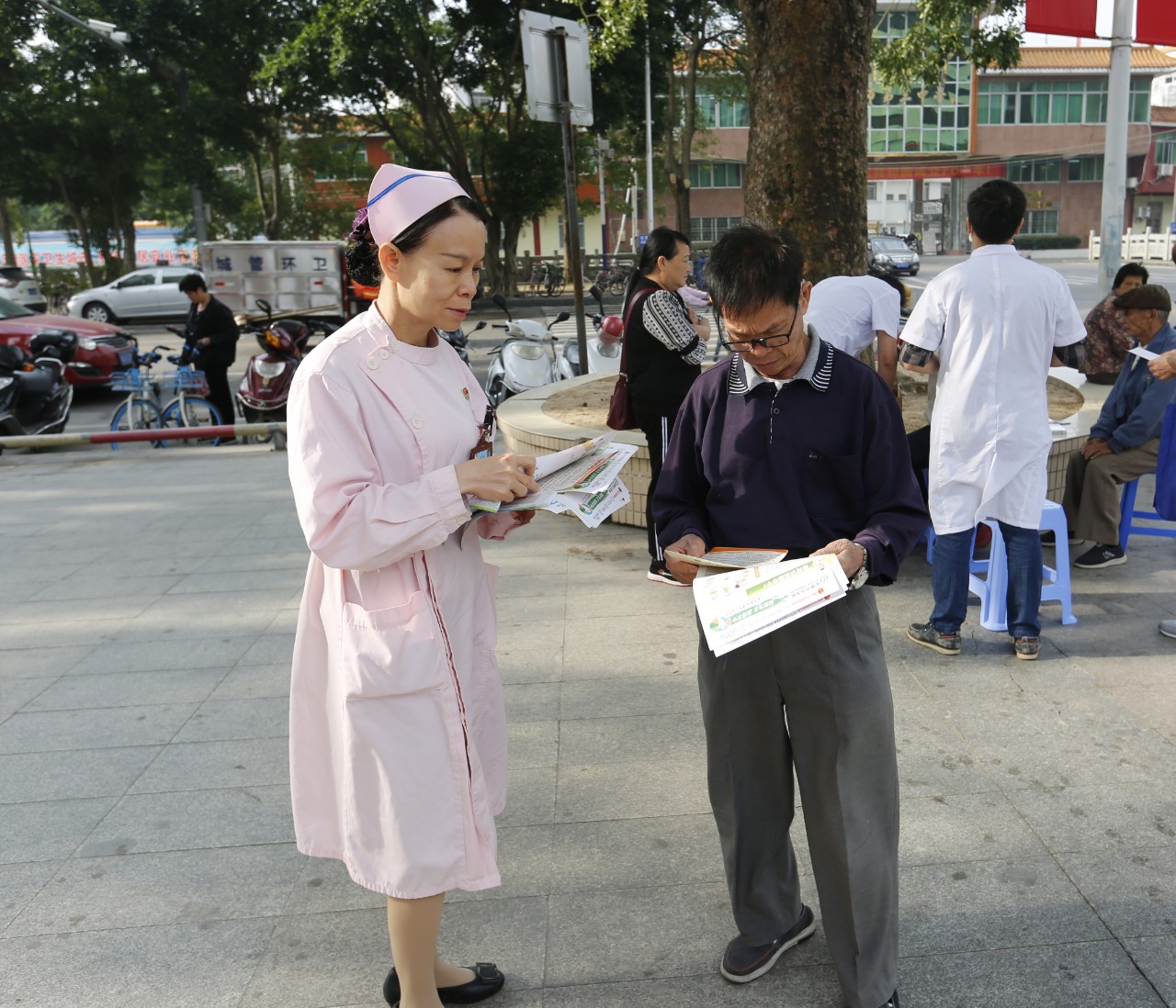 ▲工作人员现场派发预防脑卒中宣传资料