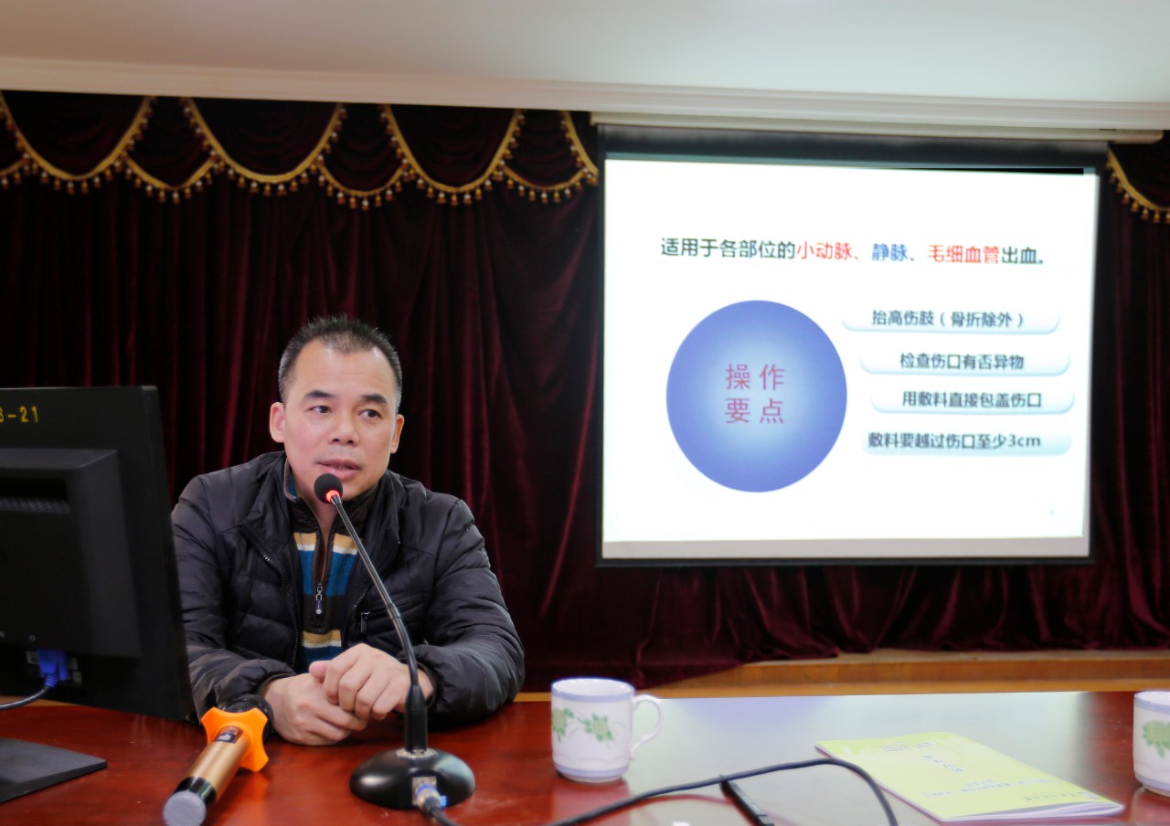 此次培训活动总共分为两个部分,理论学习与实践操作。我院急危重症中心护士长刘叶青首先通过幻灯片讲解演示,深入浅出地为教师们讲解心肺复苏术的重要性、抢救的“黄金时间”等理论知识。接着,我院急危重症中心主任王益旺为大家详细讲解了几种常用的止血包扎方法,联系实际生活,实用性强。