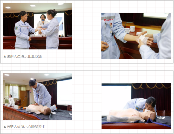 理论学习完毕后,我院医护人员在现场进行了模拟操作,分别展示了两种止血方法,还演练了心肺复苏术的操作方法,并邀请在场教师们进行现场模拟操作,现场气氛活跃,教师们积极参与现场实践。