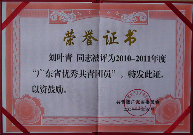 我院ICU护士刘叶青同志荣获2010—2011年度“广东省优秀共青团员”荣誉称号!