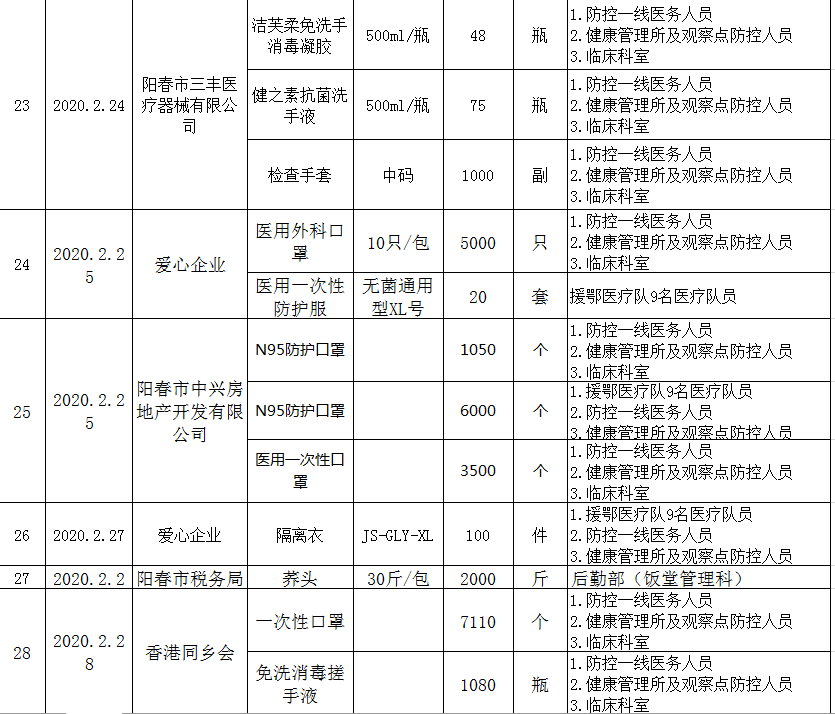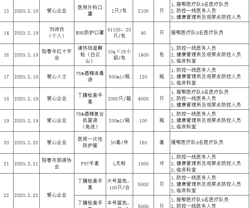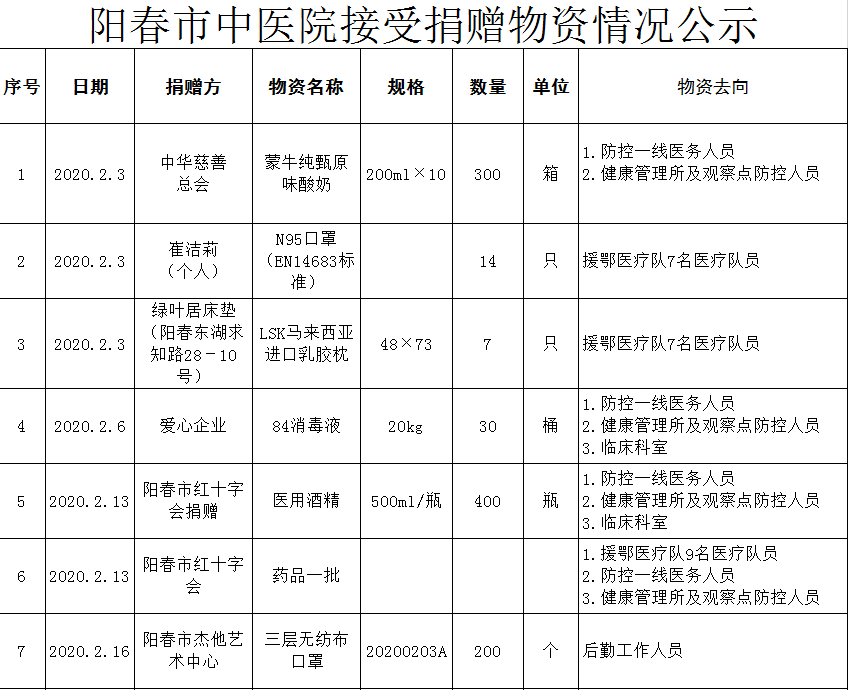 疫情无情人有情,众志成城抗疫魔。自我院发出接受社会捐赠防护物资的公告以来,社会各界爱心人士、企业积极响应,奉献爱心,为医院抗击新冠疫情提供了强有力支持,给战斗在一线的医务人员尤其是支援湖北的医疗队队员们带去了暖心的力量。在此,阳春市中医院全体员工对你们支援医院疫情防控工作表示最真诚的感谢!
