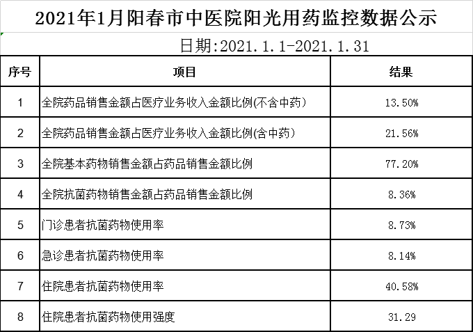 阳春市中医院阳光用药监控数据(2021年1月)