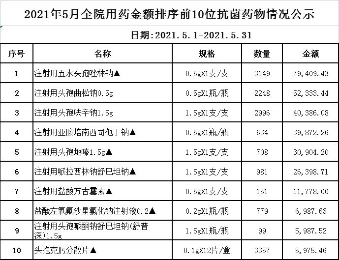 阳春市中医院阳光用药监控数据(2021年5月)