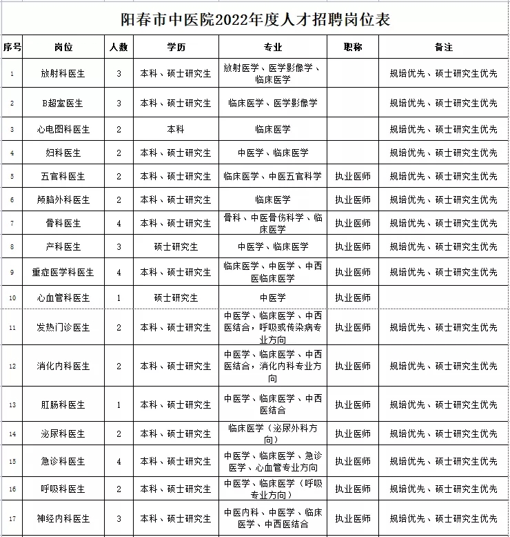 现为加强阳春市中医院人才储备,满足学科发展和建设高水平医院需要,特招聘以下人才。