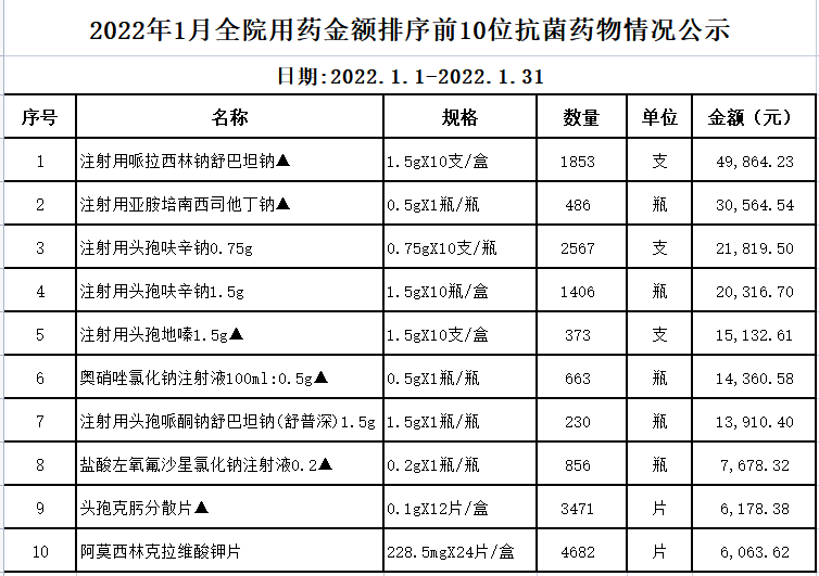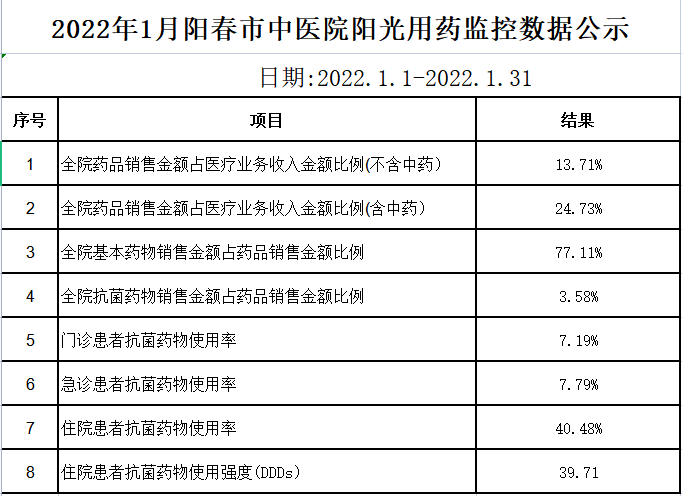 阳春市中医院阳光用药监控数据(2022年1月)