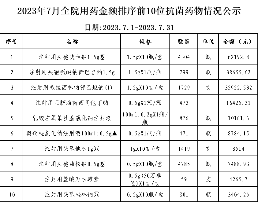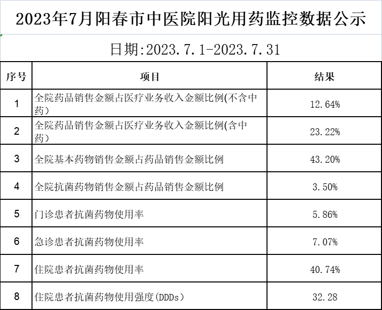 阳春市中医院阳光用药监控数据 (2023年7月)