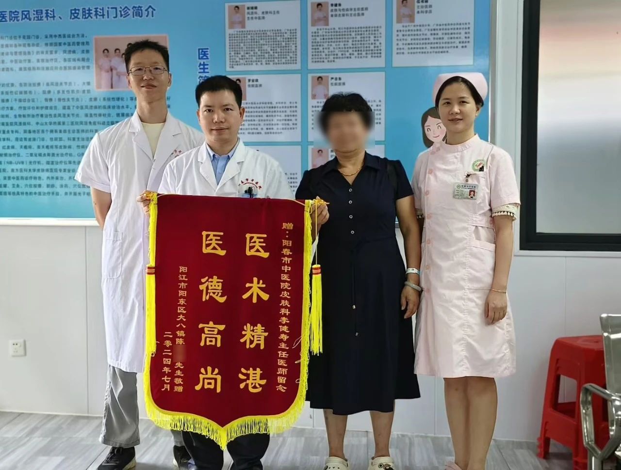 近日,患者陈先生家属将写有“医术精湛,医德高尚”的锦旗赠予我院皮肤科医护人员,以表达他的感激之情。