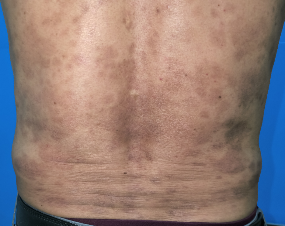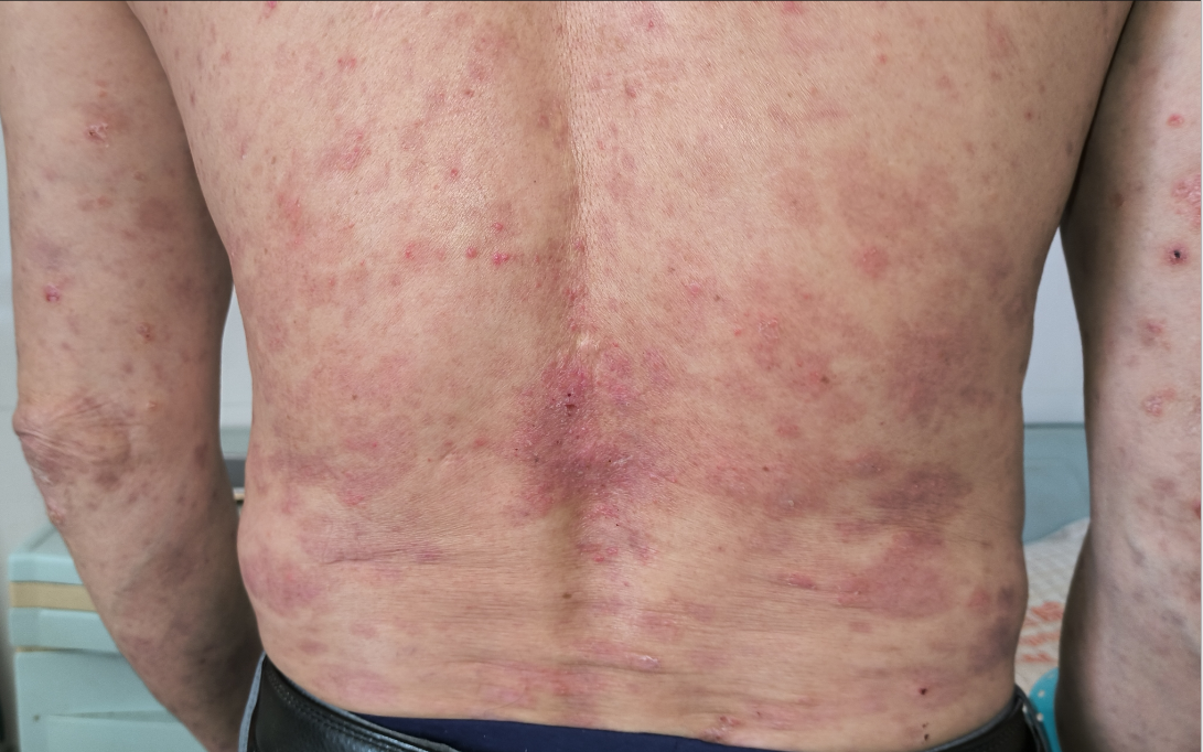 患者陈先生来自阳东,因被全身红色斑块伴瘙痒、脱屑困扰多年,曾到多家医院及诊所治疗,均未能控制病情,脱屑反而增多,病情逐渐加重。后来经人介绍,来到我院找皮肤科李健寿主任医师诊治。经过详细的查体及检查,诊断为:牛皮癣(斑块状银屑病)。患者病程长,病情较重,治疗比较棘手。李医生认真分析病情后,拟定了一套合理的治疗方案。经过1个月的精心治疗,患者的皮肤终于恢复了正常,摆脱了牛皮癣的折磨,为表达对感激之情,陈先生家属给我院皮肤科医护人员送来了锦旗。