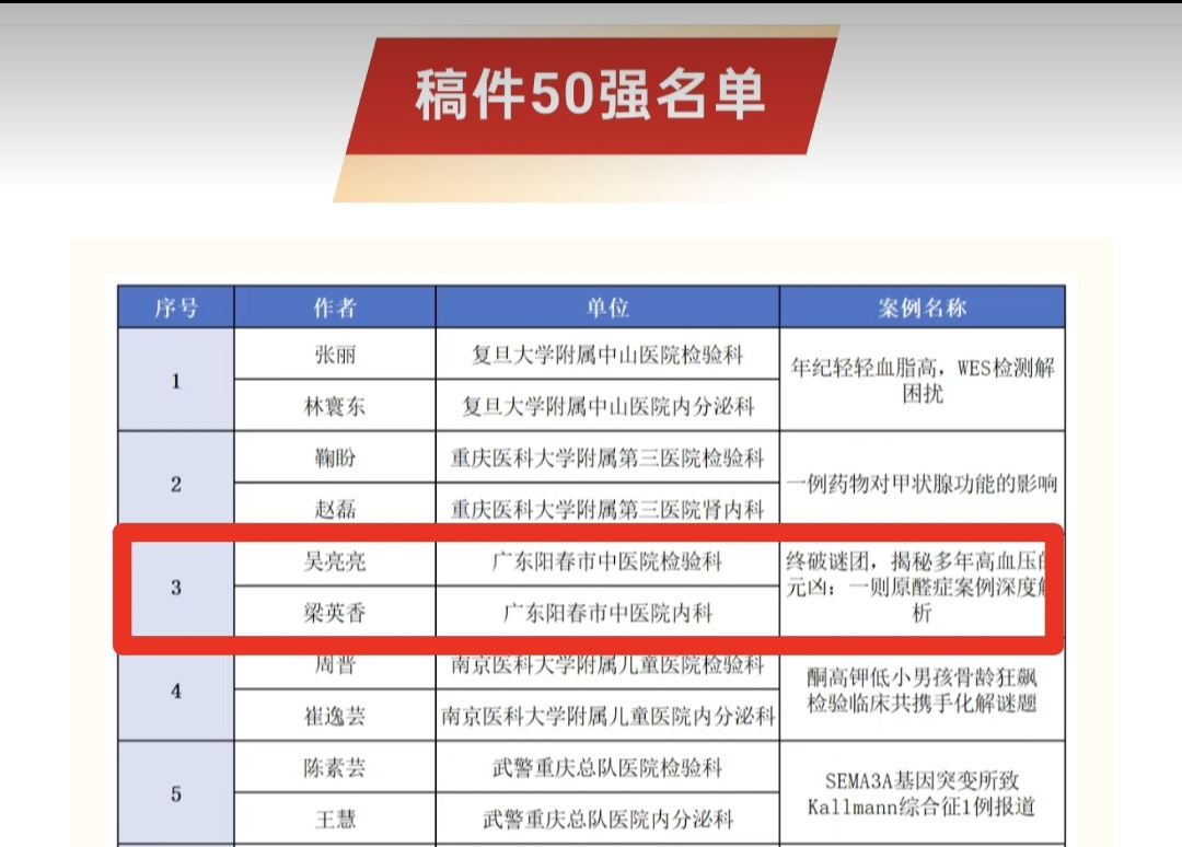 据悉,共有22组案例进入总决赛。经过激烈角逐,我院检验科吴亮亮、脑病科梁英香的作品——《终破谜团,揭秘多年高血压的元凶:一则原醛症案例深度解析》获得了全国总决赛三等奖、稿件质量排名全国第3的好成绩。