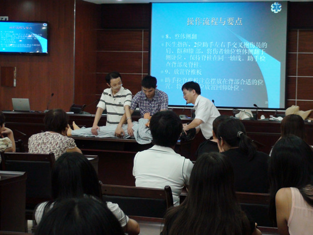 此次培训由我院长期从事急救工作,具有丰富临床经验的有关科室负责人进行。他们分别对颈椎损伤的固定与搬运、成人气管插管术、徒手心肺复苏术等急救知识进行了详细的讲解,并现场进行了技术演练。通过培训,使广大医护人员对院前急救流程和设备的使用等有了更深的认识,规范了急救流程、操作技能,强化了常用急救技能,提升了我院的院前急救水平,对广大医务工作者今后开展现场救护工作具有重要促进作用。