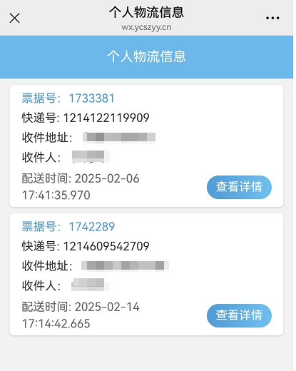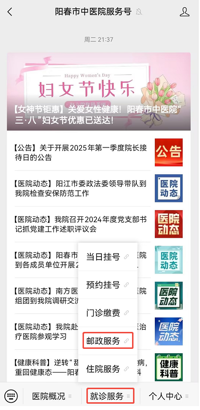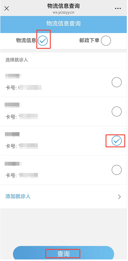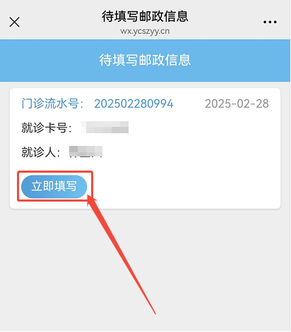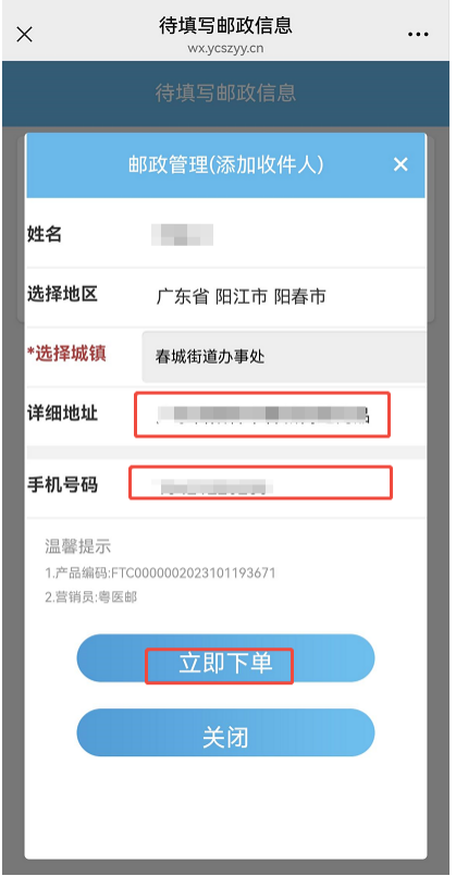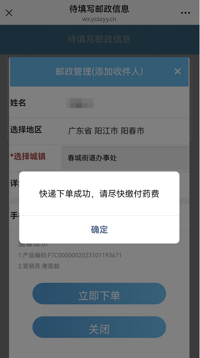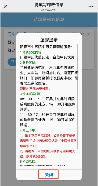 一、邮寄下单 1、进入阳春市中医院服务号,选择“就诊服务”-“邮政服务”: 2、选择“就诊人”,点击下方“查询”按钮: 3、在待填写邮政信息界面,点击“立即填写”按钮: 4、关闭“温馨提示”窗: 5、准确填写详细地址及手机号码,确认无误后点击“立即下单”: 6、下单成功,尽快线上或到收费窗口缴纳药费: 二、物流查询 1、勾选“物流信息”,勾选要查询的“就诊人”,点击查询: 2、查看物流信息: 3、物流详情: