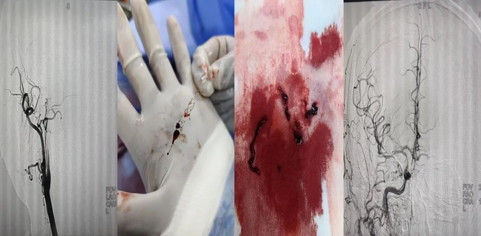 患者为51岁的男性,入院前30小时在外地工作时突发左侧肢体乏力及语言不利,后在当地医院就诊,查CTA提示右侧颈内动脉闭塞,当地医院建议行手术治疗但患者及家属考虑到手术难度、手术风险以及经济原因,采取了药物保守治疗,后患者症状持续进展,转到我院继续治疗。患者入住我院脑病科重症监护室时意识模糊、不能配合指令、眼睛凝视,我院脑病科医护团队经过讨论患者病情及影像学结果,一致认为患者年轻,若不行手术治疗可能出现生命危险,建议患者尝试取栓治疗。在和患者家属充分沟通、权衡利弊后,家属同意手术治疗。脑病科医护人员立即启动急诊取栓流程,争分夺秒抢救患者。术中脑血管造影示右侧颈内动脉闭塞,随后进行血栓抽吸、支架取栓、球囊扩张,在医护人员紧密配合下,有条不紊的开通了闭塞的血管,术后患者继续在我院脑病科重症监护室监护治疗。术后患者意识、双眼凝视好转,在脑病科医护人员精心照顾下,配合中医院特色针灸、康复理疗等治疗,患者目前语言功能、肢体肌力好转。