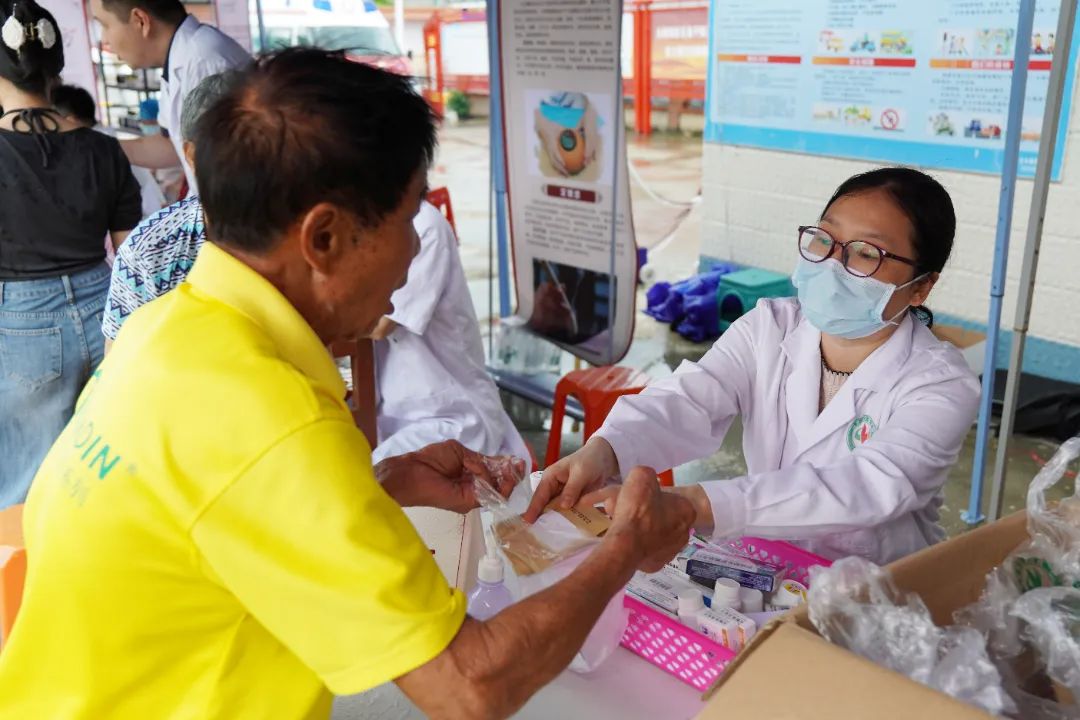 本次集市分为义诊区、中医适宜技术区、中医特色护理区、前列腺筛查区、养生茶饮区、取药区六个区域。虽然下着雨,但活动现场热闹非凡,往来村民纷纷驻足参与活动。市中医院医共体家庭医生团队在活动现场开展了免费体检和义诊活动。医护人员运用“望、闻、问、切”传统诊断法,详细询问就诊群众病史,认真诊断病情,耐心解答健康疑问,指导合理用药,传授饮食调养、运动保健、穴位按摩等养生方法,免费发放药物和养生茶饮包,并对颈肩腰腿痛患者现场开展针灸、火龙罐、艾灸等中医特色治疗。