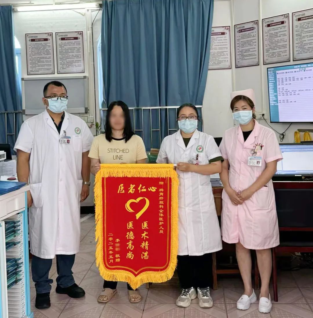 4月底,李女士因“急性胰腺炎”入住我院脾胃肝胆科。入院后,在科主任陈明仁的带领下,迅速制定详细的治疗方案,通过中医为主,中西结合的方法,患者的病情得到控制,避免有重症胰腺炎的发生。住院期间,陈主任基本每天都带领医护团队精心查房,研究病情,同时还手把手教会李女士如何调整饮食。据李女士回忆道:“最难受的时候,是他们的专业和耐心让我挺了过来。”针对急性胰腺炎患者的特殊需求,他们团队制定了“分阶段饮食计划”,从禁食到逐步开放流质饮食,每一步都科学严谨,确保患者安全过渡。在脾胃肝胆科医护团队的精心治疗下,患者日渐康复,各项指标恢复正常,最终康复出院。近日,李女士携家人专程返回医院,将一面写着“医德高尚 医术精湛”的锦旗送到我院脾胃肝胆科医护人员手中。