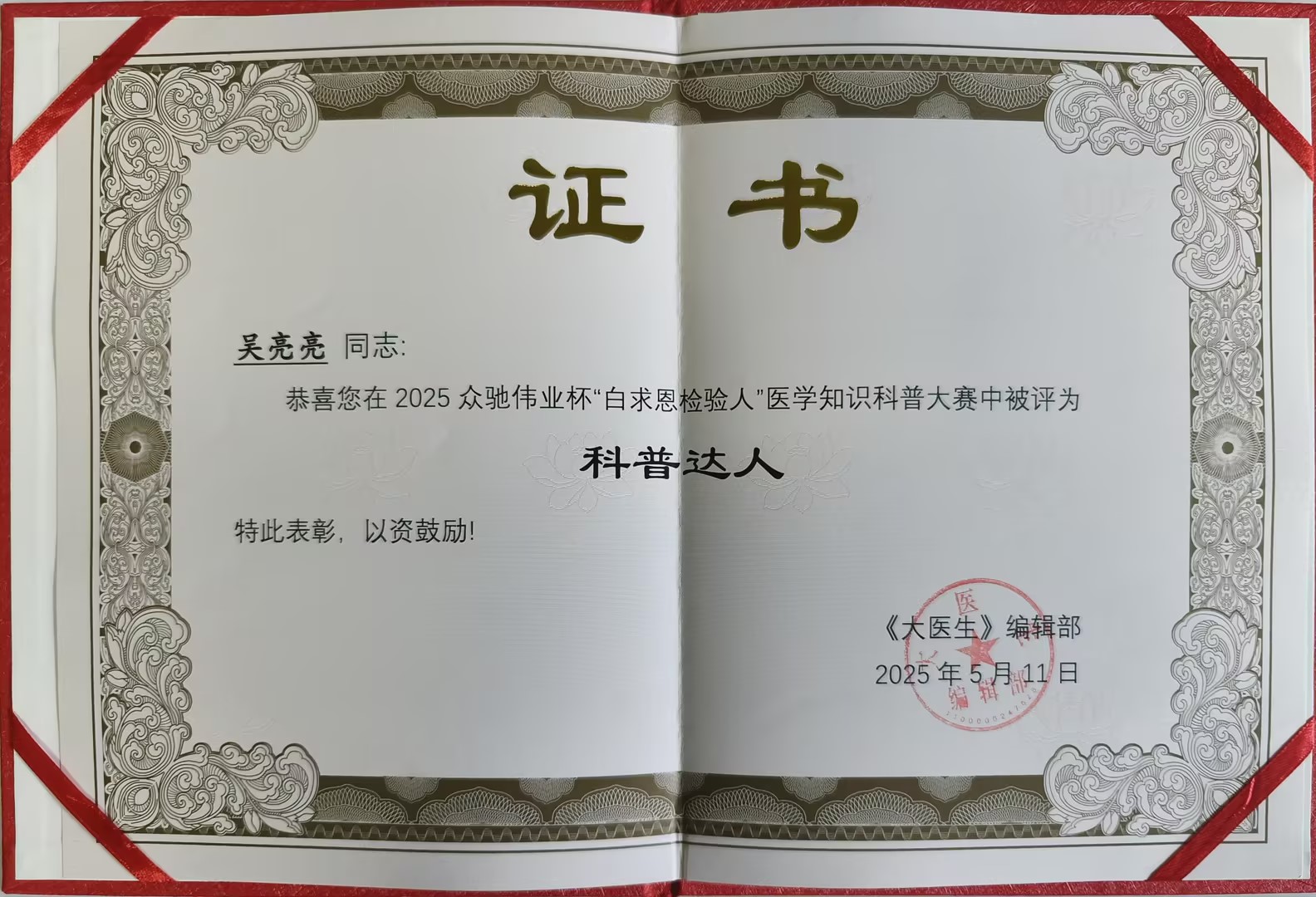 近日,由《大医生》杂志主办,白求恩精神研究会检验医学分会学术指导,万方医学、MIR医学仪器与试剂协办的2025第二届众驰伟业杯“白求恩检验人”医学知识科普大赛获奖名单公布。本次大赛共收到来自全国各地的2000余份参赛作品,经过作品征集、刊社初审、网络投票与专家评审等多个环节,我院检验科吴亮亮凭借其扎实的专业知识和出色的科普能力,在比赛中脱颖而出,荣获“科普达人奖”。 我们对获奖人员表示热烈祝贺,并期待获奖人员再接再厉、发扬成绩,积极推动健康科普工作,未来继续为公众提供更多高质量的健康科普内容。