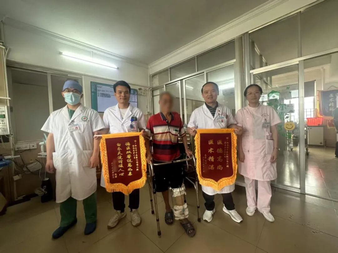 近日,一位因左胫腓骨开放性骨折而经历多次手术的患者在我院骨伤科(创伤二科)医护团队的精心治疗及护理下出院。患者及家属对我科医护人员的精湛医术和悉心照料表示衷心感谢,为表达感激之情,特赠送锦旗两面:一面称赞占卫兵主任“医德高尚,医术精湛”,另一面赞誉创伤二科全体医护人员“医德双馨视患如亲,白衣天使情暖人心”。