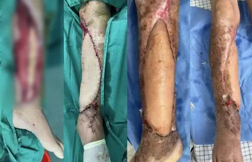 ▲患者行皮瓣修复创面术前后