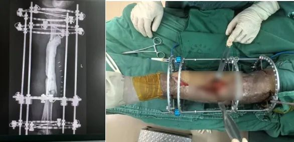 最终,为患者实施左胫骨开放性骨折术后骨髓炎清创、病灶清除+截骨+骨水泥填充术+环形外固定支架固定术,解决骨髓炎问题,并为骨折愈合提供了稳定环境。经过多次手术和术后康复治疗,患者创面完全修复,功能恢复良好。