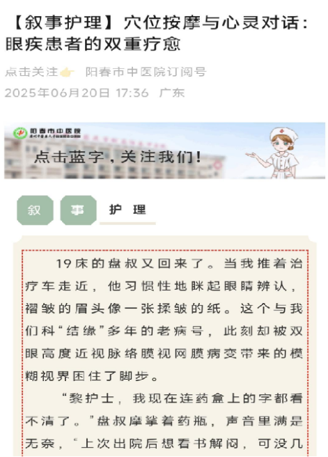仁心护老,悦享夕阳 阳春市中医院老年病科 阳春市中医院老年病科是阳春市内最早成立的老年病专科,是集临床医疗、教学、预防、保健与康复为一体的综合性科室。科室开放床位30张,配备肺功能检查仪、支气管镜、无创呼吸机、高流量呼吸湿化治疗仪、震动排痰仪、上下肢主被动康复训练器等先进诊疗设备,同时设有老年病专科慢病管理门诊,可为老年患者提供从体检、门诊诊疗、住院治疗、康复护理到健康咨询的一站式全流程综合性诊疗。 科室现有副主任医师5人、主治医师1人、住院医师2人,研究生1人,护理团队包含主管护师8人、护师1人、护士2人,并承担临床教学任务。团队始终秉持“仁心护老,悦享夕阳”的服务宗旨,以中医整体观为指导,为老年患者提供全周期、个性化、有温度的优质医疗服务。 一、厚植人文文化底蕴,铸就温暖根基 (一)凝练人文理念与价值观 △叙事护理,倾听故事,让患者在叙事中感受被理解和尊重,增强其应对疾病的信心和主动性 △开展医养结合“俱乐部”,丰富人文活动,共筑温暖氛围 (二)精心营造人文氛围 △关怀墙:温暖记忆的可视化载体 △共享图书角:精神滋养的微型空间 二、优化人文管理模式,激发团队活力 (一)完善制度规范,提升服务品质 △制定《老年患者入院关怀流程》 (二)加强员工关怀,增强职业归属感 △开展“老年护理减压工作坊” 三、升级人文环境设施,打造舒适空间 (一)推进适老化环境设计 △水果病房,提升老年患者识别便利性 △五行音乐播放器:调节情绪与缓解压力 △完善便民服务设施 (二)安全风险评估与保障 △防走失马甲守护患者安全防线 四、深化人文护理与医养结合实践,提升服务内涵 (一)创新健康教育,推行“银龄关怀” 计划 (二)加强专科护理建设,中西结合康复锻炼 △最强气功 △腰痛患者康复锻炼 △八段锦团体训练:身心共养的互动实践 △八虚拍打 康复有温度,关怀每一步 阳春市中医院康复科 阳春市中医院康复科自2002年创立以来,是粤西地区规模最大、设备最齐全的康复理疗中心、国家农村医疗机构针灸理疗康复特色专科、广东省“十一五”中医特色专科、广州中医药大学第一附属医院针灸科合作科室、广东省第二中医院"康复联盟"合作科室、广东省针灸学会肥胖专病联盟理事单位、阳江市康复专科联盟成员单位。科室邀请广东省第二中医院康复治疗部主任杨栋定期来院诊疗,指导现代康复技术;邀请北京汉章针刀医学研究院广东学术部会长李展新,定期来诊。科室汇聚专业团队,包括医护人员40名,涵盖副主任医师2名、主治中医师4名、住院医师5名、主管康复技师及康复技师共8名,以及副主任护师1名、主管护师4名、护师及护士12名。 开放床位51张,科室常规诊疗涵盖神经损伤类疾病,包括脑梗死、脑出血恢复期及后遗症,脊髓、脑外伤康复等,以及面瘫治疗;同时擅长痛症类疾病,如颈椎病、腰椎病、肩周炎、骨性关节炎的康复理疗;运动康复治疗神经系统疾病(如脑卒中后偏瘫、颅脑外伤后截瘫等)、骨科疾病(如四肢骨骨折术后、全髋关节置换术后、运动损伤等)、老年康复(如骨关节炎、平衡能力差等)。科室在中医领域具有显著优势,主要治疗的病种涵盖“中风、面瘫、漏肩风(肩周炎)、项痹(颈椎病)、腰痛”等。科室目前开展的特色技术——针挑疗法,不仅荣获了广东省中医药科技进步奖,还被卫生部纳入临床适宜诊疗技术范畴,相关整理和研究项目也已顺利通过国家中医药局专家组的验收;还开展小针刀、火针、针灸、推拿、穴位贴敷、中药热奄包治疗、耳穴压豆、火龙罐、腕踝针、火龙灸治疗、颈椎牵引、腰椎牵引等中医特色治疗项目。科室全体医护人员以患者为中心,提供专业与人文关怀相结合的综合性、个性化康复服务,成为区域内康复领域的标杆科室。根据康复科满意度调查分析报告,患者普遍认为医护人员服务态度好、技术熟练,治疗过程科学、安全、有效,医疗设施完备、先进,环境卫生状况良好。这些都为各类患者提供了高品质、全周期、精准有效的康复服务,助力患者重获健康、回归生活、融入社会。 一、工休座谈 加强医护人员与患者及家属之间的沟通交流,倾听大家的心声,共同为提升康复治疗效果、优化科室服务出谋划策。 二、公益剪发:护士化身 “理发师”,传递爱与关怀 在康复科这个充满希望与温暖的地方,每天都有无数感人的故事在上演。康复科的护士们手执剪刀,化身为爱心“理发师”,免费为患者修剪发丝,以行动诠释爱与关怀的真谛,为患者的心灵带来一抹别样的温暖与惊喜。护士们早早备齐了一应俱全的剪发工具,梳子、剪刀、电推子等井然有序,于康复科一隅精心打造出一方温馨小天地,简单装点之下,一个临时的“理发店”便温馨呈现。 三、美化病区 家属轻弯下腰,便捷的开水服务如暖流般温暖人心。我们持续优化环境,以无微不至的关怀,铸就人性化优质服务,让每一刻的陪伴都洋溢着温情与安心。 四、康复科里的别样生日会:主任、护长送关怀,温暖康复路 在医院的康复科,除了专业的治疗与悉心的护理,还有一份别样的温暖在悄悄传递。每个月,康复科主任都会精心组织一场特殊的慰问活动,为当月生日的患者们送上饱含祝福的生日贺卡以及贴心的小礼物,让患者们在康复治疗的日子里,也能感受到家一般的温馨与关怀。