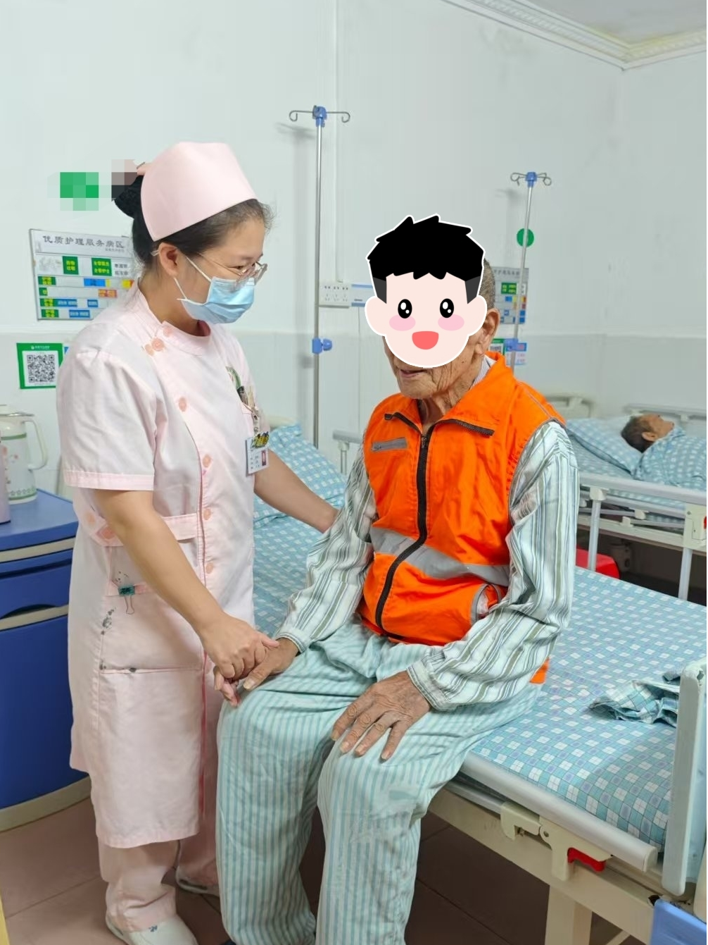 易爷爷低头瞅着胸前的马甲,忽然笑了:“这衣裳……跟村里的治安巡逻队穿的一样。”小潘蹲在他面前拉着马甲的拉链,听见这话也笑了:“对呀,您穿上这个,就是咱科里的‘安全巡逻员’,帮我们看看走廊里有没有‘小坏蛋’。”他糊涂的时候,最吃“戴高帽”这一套。果然,易爷爷挺了挺腰板,手不自觉地摸了摸马甲的口袋:“那我得好好看。”小潘趁机递过一杯温水:“巡逻也得先喝水,不然没力气。”易爷爷捧着水杯,指尖在杯壁上慢慢摩挲。小潘坐在旁边的椅子上,没再说话,只是陪着他。走廊里静悄悄的,只有墙上的钟表滴答作响。这次他眼神清明,显然清醒了。“您看,这马甲穿着舒服不,穿上它,万一您想走走,我们远远看见这亮色,就能快些过来扶您。”马甲套上他单薄身体的瞬间,那抹鲜亮的橙色在凌晨的灯光下骤然跃出——它不再仅是冰冷的警示标识,更像一道温暖环绕的光晕,轻轻裹住了他孤独无依的身形。