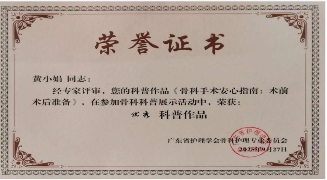 近日,由广东省护理学会单位主办的第九届理事会骨科护理专业委员年会暨骨科专科护理能力提升培训班在广州隆重举办,本次赛事聚焦骨科护理领域的科普创新,吸引全省多家医疗机构参与,竞争激烈,我院骨伤科(骨二科)的科普作品《骨科手术安心指南:术前术后准备》在比赛中荣获“优秀科普作品”奖。