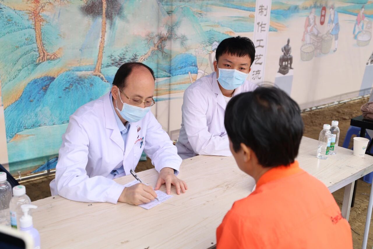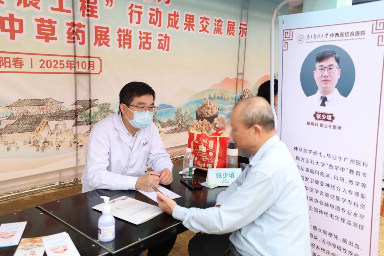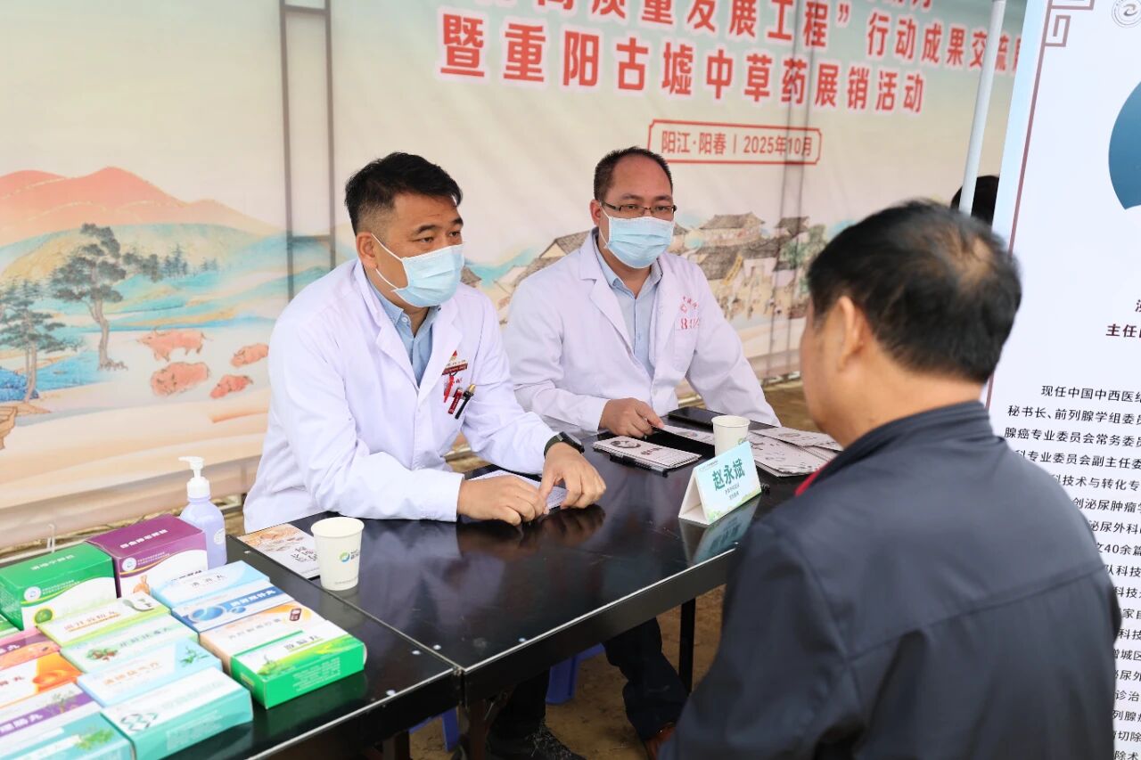 2025年阳江市中医药助力“百县千镇万村高质量发展工程”行动成果交流展示暨重阳古墟中草药展销活动期间,来自南方医科大学中西医结合医院肿瘤科、脑病科、全科医学科、泌尿外科、骨伤科等科室专家联合我院专家在现场开展了大型义诊活动,送健康到群众家门口。专家们耐心细致地为每一位前来咨询的市民进行免费的一对一把脉问诊,深入辨析体质,解答健康疑惑,并提供了个性化的治疗建议和养生调理方案,让市民在家门口就享受到了顶尖的中医诊疗服务。