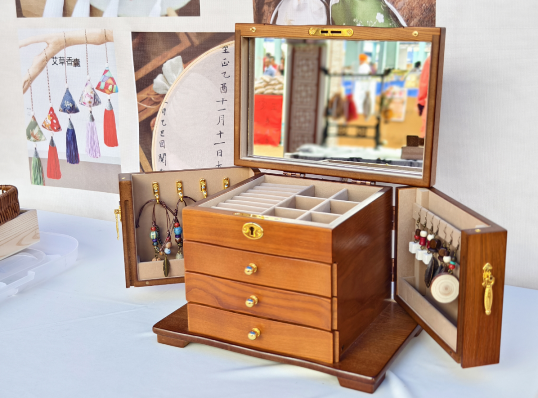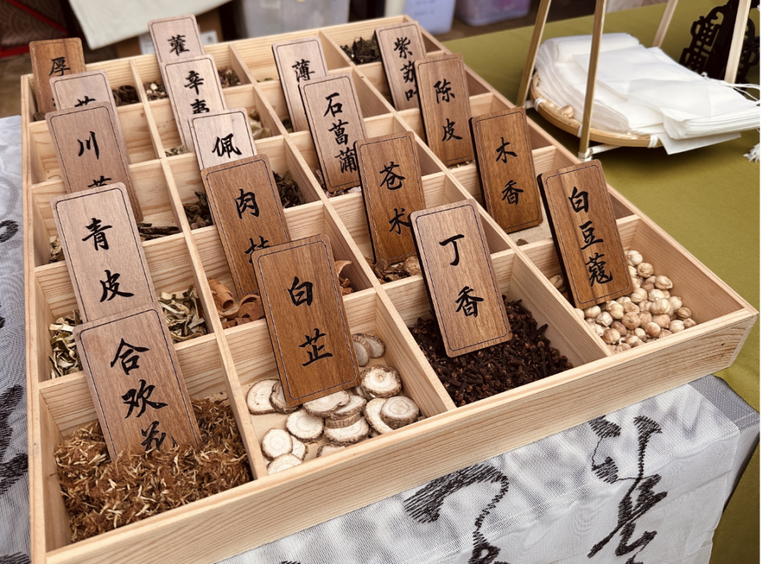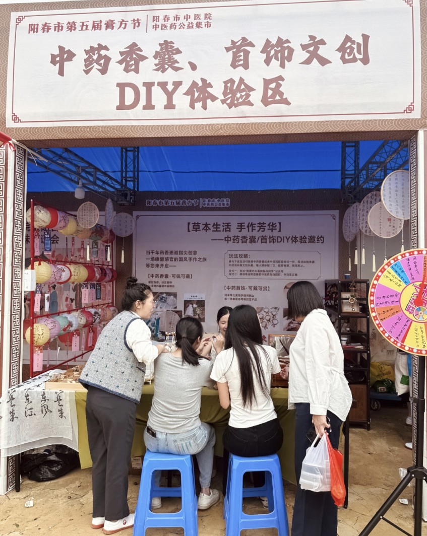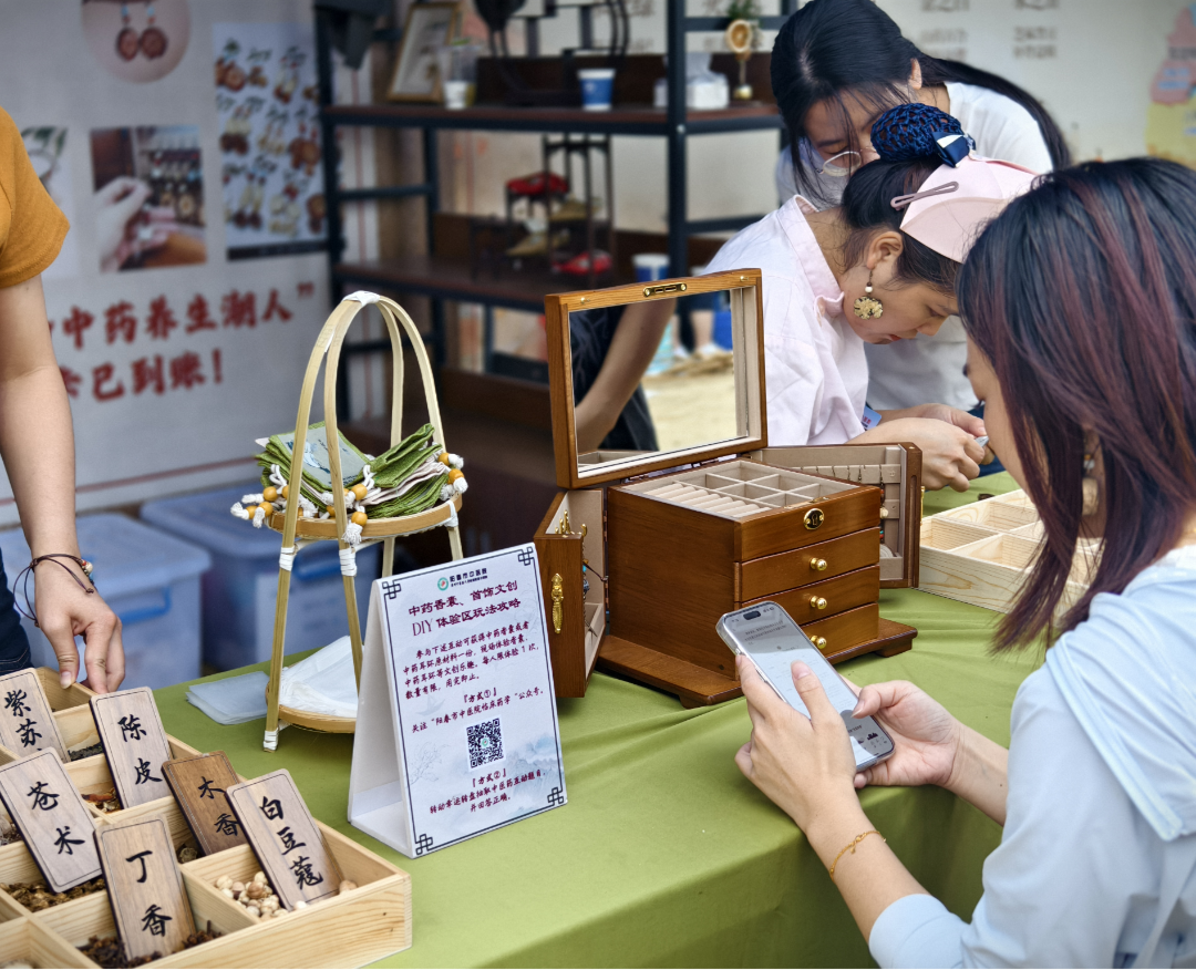 活动现场,古色古香的展位前人头攒动,空气中弥漫着艾草、薄荷、陈皮等本草的清雅香气。我院精心筹备了中药香囊DIY制作、中药耳环DIY两大核心文创体验项目。