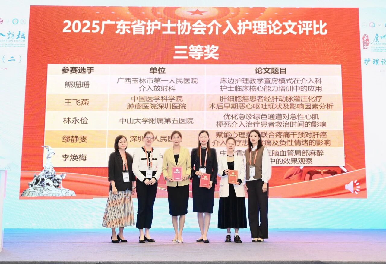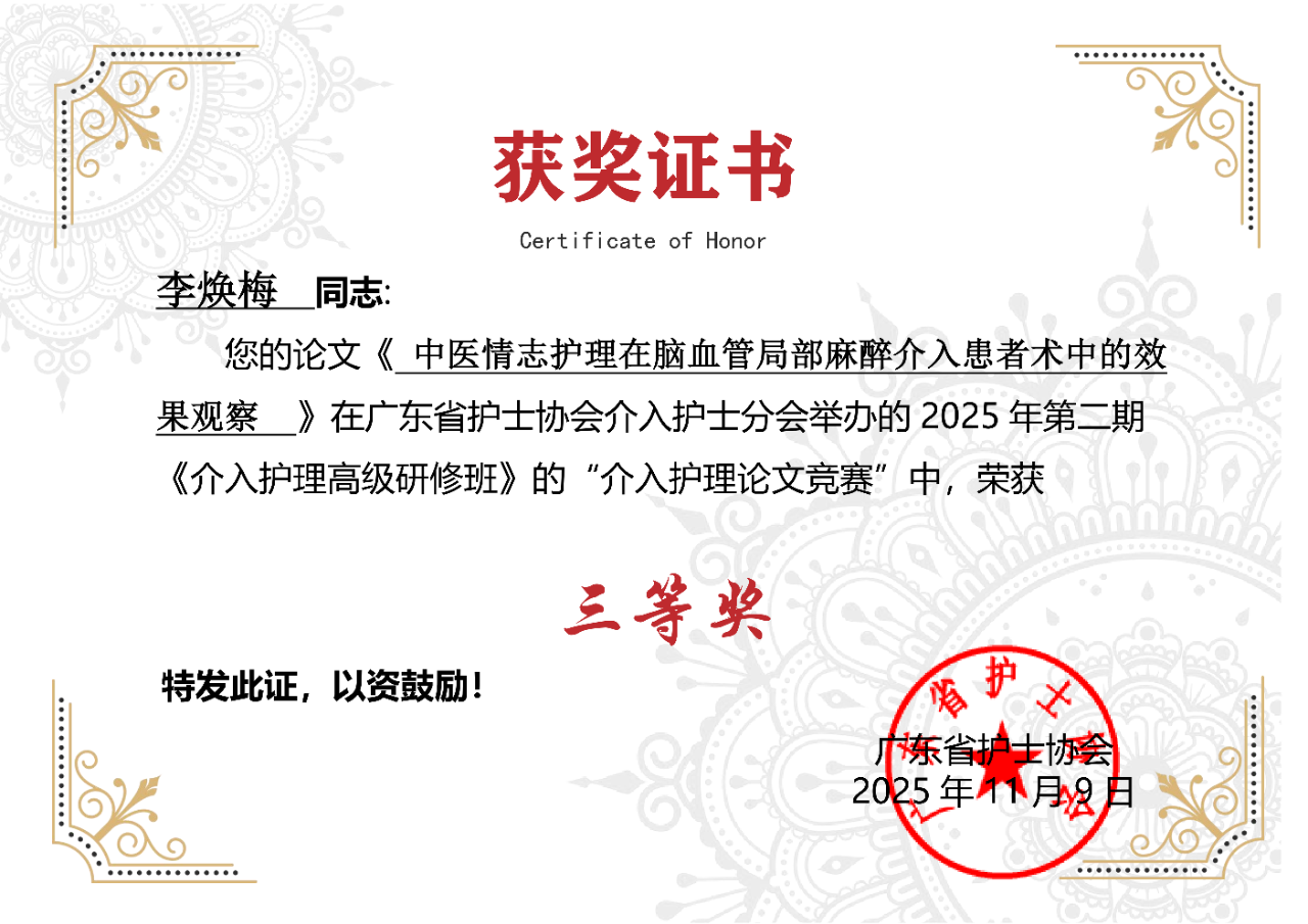 近日,由广东省护士协会举办的2025年介入护理高级研修班(第二期)暨广东省护士协会介入护士分会年会圆满举行。在此次盛会中,我院介入室和脑病科护理团队共同参与研究,撰写的论文《中医情志护理在脑血管局部麻醉介入患者术中的效果观察》脱颖而出,荣获三等奖。