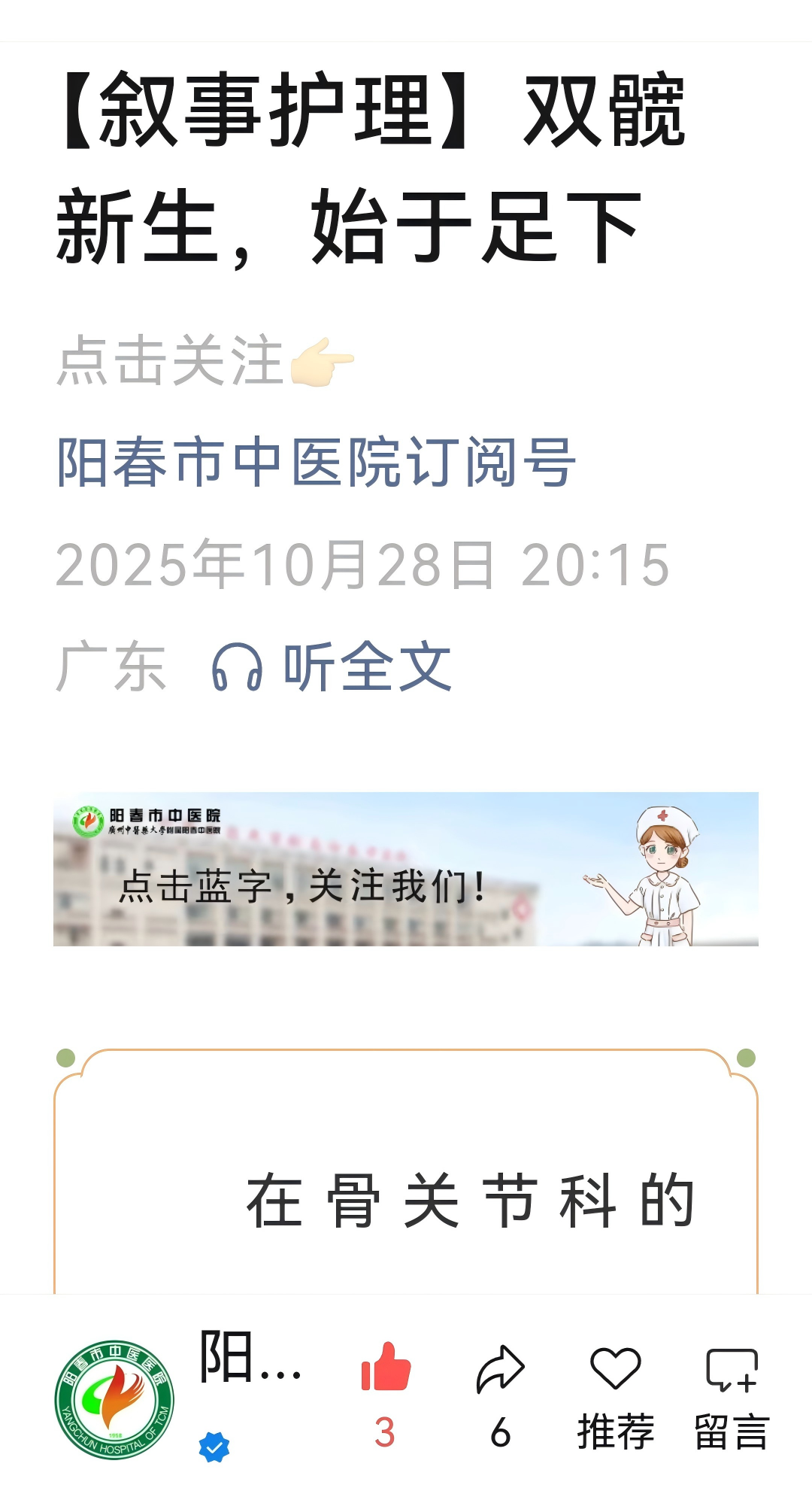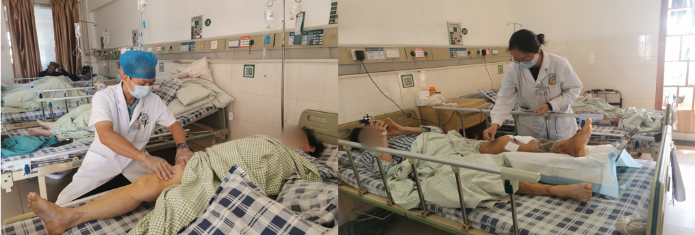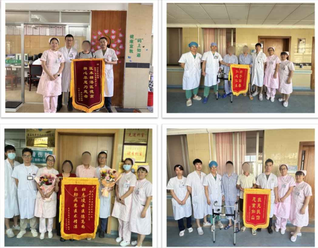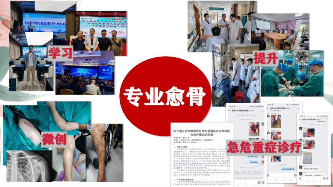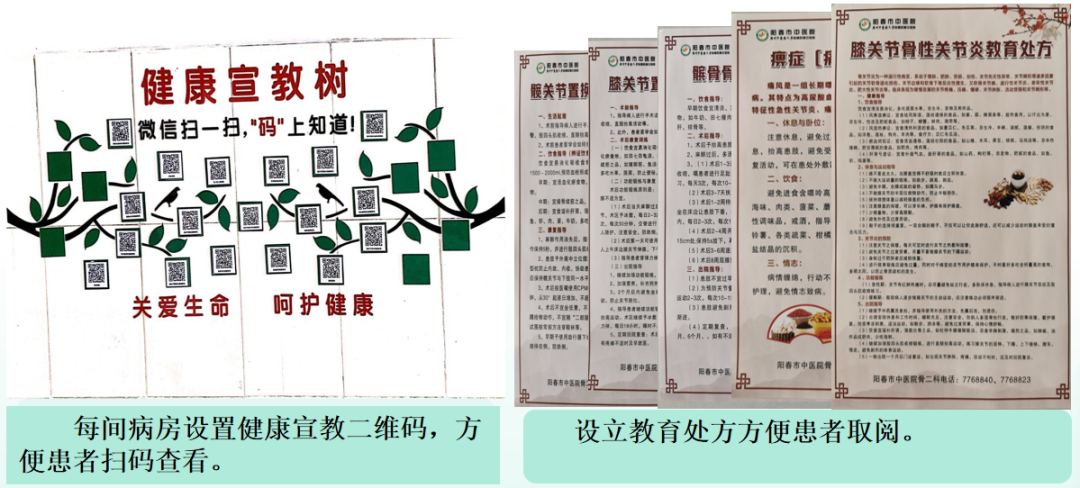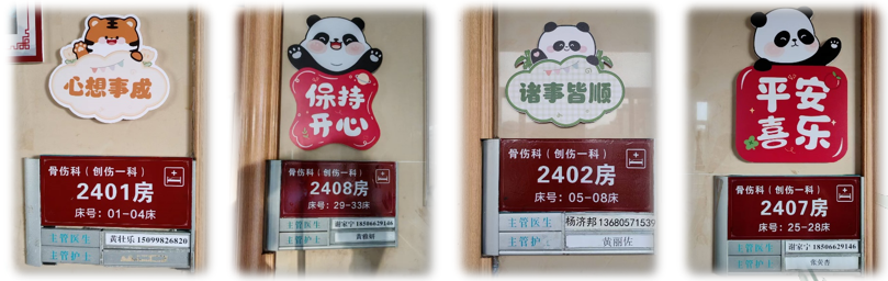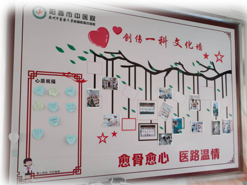 愈骨愈心,医路温情 阳春市中医院创伤一科 阳春市中医院骨伤科(创伤一科),是广东省十二五特色专科,是我院重点发展专科、龙头科室、创伤中心核心科室,广东省骨科协会阳江分会常务委员单位,阳江市骨科协会创伤骨科分会副主任委员单位,是集医疗、教学与科研为一体的临床科室,倡导中医为主、中西医结合的发展理念,主要采用传统中医药治疗结合现代化技术为诊疗模式,开展各种创伤救治工作。 科内设有下肢骨科、小儿骨科、环骨盆创伤三个亚专科组,三级医护人才梯队合理,技术成熟先进。科室常年与南方医院、南方医科大学附属第三医院开展紧密的协作,建立广东省博士工作站,柔性引进了胡岩君、林庆荣、魏宽海等多名专家教授,定期到我院坐诊及进行技术指导。 科室全体人员将以精准医疗治愈骨伤,以人文关怀疗慰心灵,构建有温度的创伤骨科(生理、心理、社会)诊疗服务体系。 ·专业愈骨 △透明医疗 △主管医师协助快速康复 ·“爱心家园”计划——营造温馨环境 △改善科室环境 △加强便民服务 △开展多形式科普 ·“心灵加油”计划——关注心理与家庭 △让照顾贴心化 △“喘息服务”:让家属休息下 △获得患者及家属的锦旗及表扬信 △医患暖心时刻 关爱关节,精准康复、全程呵护 阳春市中医院骨二科(关节骨病科、运动医学科)是广东省膝关节炎保膝联盟成员单位科室,亦是骨质疏松防治基地科室,集医、教、研为一体的综合科室,本科诊疗范围包括肩、髋、膝、肘、踝等关节疾病。本科拥有医护共19人,其中主任中医师1人,副主任医师1人,主治中医师及主治医师各1人,住院医师3人(硕士研究生),副主任护师1人,主管护士3人、护师6人,护士2人。科室开放33张床。本科诊疗技术中西并重,传统中医特色治疗结合现代先进医疗技术推动科室发展,传统中医特色技术包括:中药内服外敷、穴位贴敷、艾灸等,人工关节置换技术、关节镜微创技术在阳江地区处于先进地位。 ·优化住院环境,改善患者就医体验 1.每个病房门口及病房里面放一束鲜花,美化环境;为患者提高舒适度,为每床病人提供专人专用水壶,饮水更便捷、放心、又卫生。 2.护士站的贴图,是我们对患者承诺,增加患者的信任感。 3.一面花墙的“休闲吧”是病区里的“小温柔”,靠窗的小圆桌配着轻便座椅,晨光裹着窗外的绿意漫进来,桌上的鲜花把病房的清冷柔化了不小。 4.呼叫铃贴上夜光贴,避免跌倒、坠床等不良事件的发生。 ·聚焦快速康复,改善患者体验与康复效果 1.为患者进行健康宣教。 2.为有需要的患者(预防髋关节置换术后脱位)提高T型枕头、防外旋板,有效预防关节假体脱位的发生。 3.为患者(预防肺部感染)提供气球,让患者吹气球,让肺部运动,锻炼肺活量,降低并发症的发生。 4.早期下床活动(预防血栓形成),快速康复。 5.中医赋能,助力康复。 ·医护康一体化查房,优化患者诊疗与康复流程 1.医护康一起查房,确定诊疗方案、康复指导。 2.康复治疗师深入病房为病人行康复治疗。 ·深化人文关怀 1.开展人文关怀培训。 2.开展科室礼仪培训。 3.小小文化墙,在传递科室文化,营造温馨氛围,加强医患沟通以及弘扬社会正能量等方面都发挥重要作用。 4.心愿墙,让患者、家属及科内医护人员留下想说的话,进一步了解患者及科内医护人员心声,心愿墙上不仅有小小的心愿,又有真诚的鼓励、衷心的祝福、郑重的感谢等。 5.病房床头栏内放置防跌倒、防坠床、防压疮、防深静脉血栓等警示标识,为患者放置床栏,保障住院病人安全。 6.每间病房墙上粘贴预防跌倒十知道,并在床头贴“起床三个一分钟”,卫生间门口粘贴小心台阶等温馨提示,保障病人的安全。 7.多元化健康宣教。 8.春节期间科室主任为每一位住院患者送上新年的祝福,住院期间也感受到关怀、节日的氛围,在一个有爱的环境早日康复。 9.帮助患者剪指甲、跟患者聊天。 10.小小“手术加油牌”,传递温暖与鼓励。 11.讲讲护理工作中“暖心”的小故事。 ·提升患者满意度