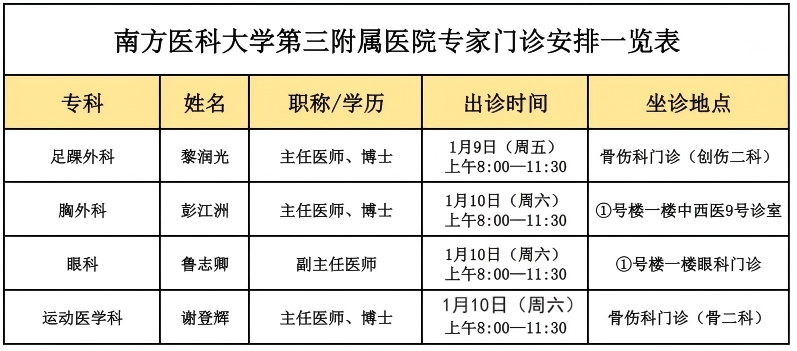 【省级专家坐诊消息】1月10日南方医科大学第三附属医院专家团队将到我院坐诊