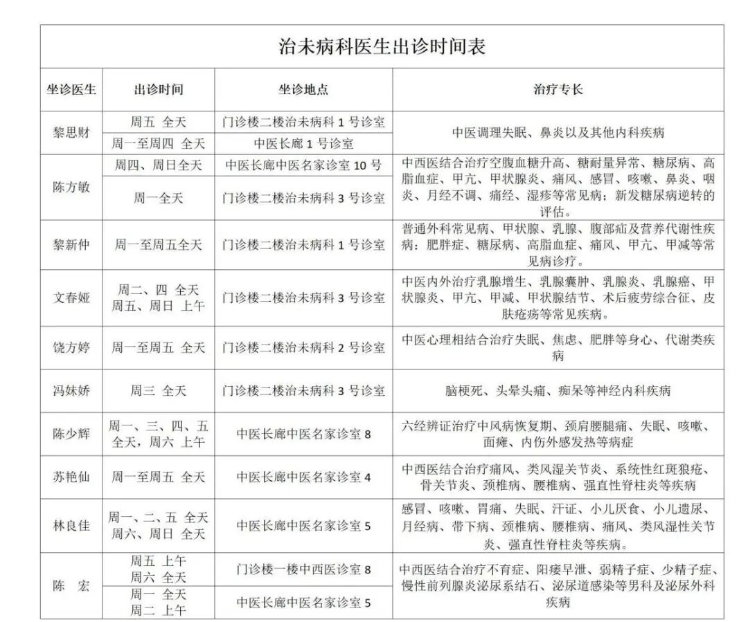 注:节假日出诊安排另行通知(可关注我院订阅号、服务号或咨询导诊台)。