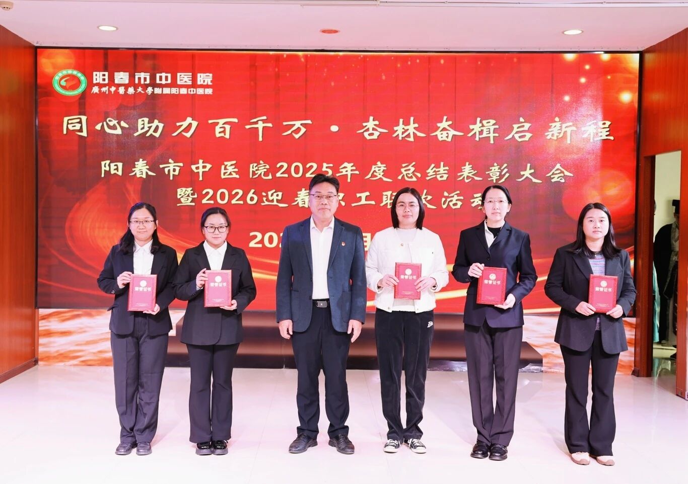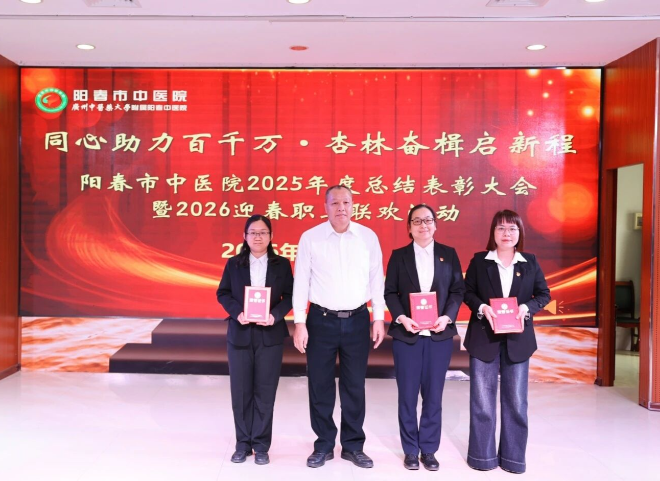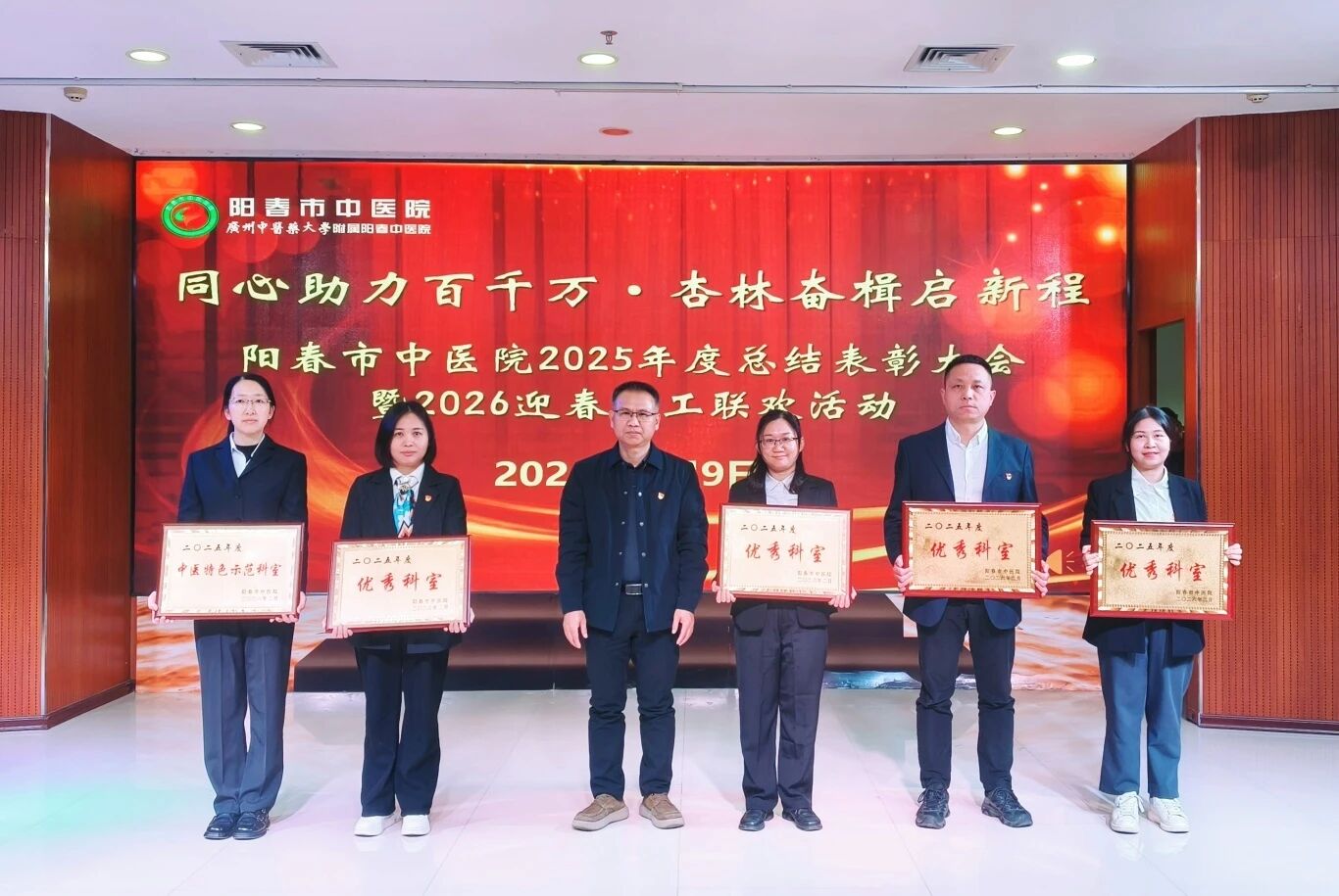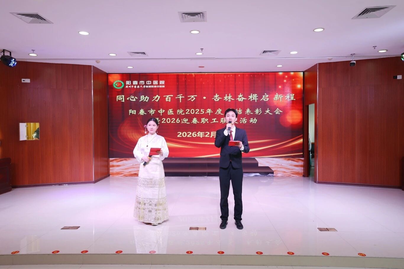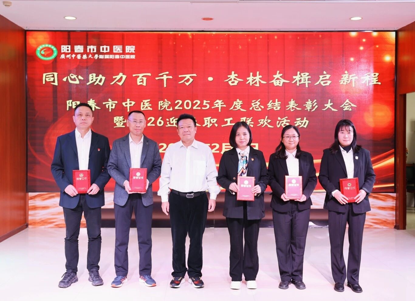 回首,是为了更好地蓄力;总结,是为了更好地前行。2月9日下午,我院举办了“同心助力百千万·杏林奋楫启新程——2025年度总结表彰大会暨2026迎春职工联欢活动”。医院党政领导班子、全体获奖人员及职工代表齐聚一堂,共忆耕耘硕果,共话发展新篇,为2025年的奋斗历程画上圆满句号,为2026年的新征程吹响奋进号角。