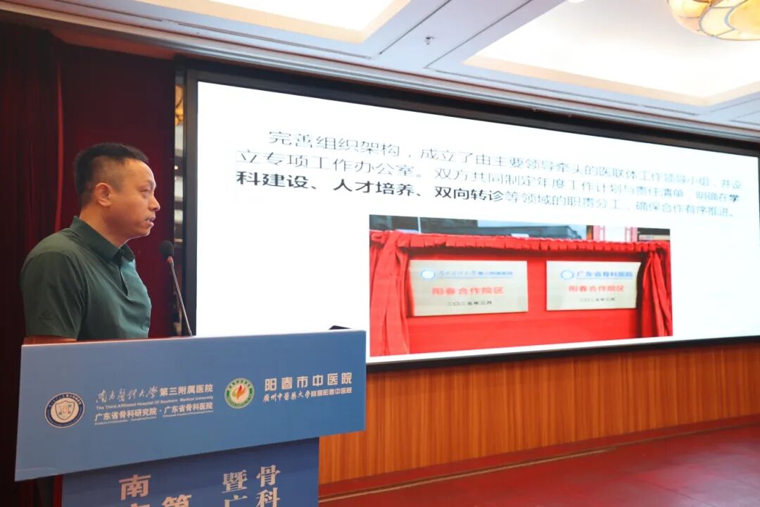 我院院长朱家志介绍了医院与南医三院、广东省骨科医院自2025年3月挂牌合作院区以来,在提升管理效能、培养骨干人才、推动优质医疗资源下沉等方面取得的显著成效,并表示作为医联体成员单位,我院将更加积极主动融入南医三院医联体建设大局,继续深化对接合作,聚力强化学科和人才建设,不断提升服务能力,为提升医联体整体医疗服务能力和健康广东建设贡献阳春中医人的力量。 △我院院长朱家志致辞 南医三院党委副书记、院长黎程回顾了医联体和广东省骨科医院医疗集团发展历程及过去一年取得的工作成效,并针对当前医疗行业挑战,提出未来将聚焦膏方、院内制剂、康复辅具、药膳、临床营养等特色业务。南医三院将继续弘扬共商、共建、共享的精神,凝聚智慧,汇聚合力,共同推动广东省骨科医院医疗集团建设和医联体建设迈向更高水平发展阶段,为健康广东、健康中国建设作出更大贡献。 △南医三院党委副书记、院长黎程致辞 上午的医联体工作会议中,南医三院医务科负责人王亚男,门诊部主任陈云,事业发展部主任刘俐,质量管理与评价科副主任、运营管理办公室副主任韩栋、临床营养科负责人胡世弟分别围绕“医院关键运营环节效能优化实践与成效”“多维度打造门诊品牌,助力医院高质量发展”“广东省骨科医院医疗集团‘强筋健骨行’巡回公益诊疗活动方案介绍”“数据驱动助力医院运营管理”“从‘边缘’走向‘C位’——临床营养科高质量发展的机遇与挑战”作专题报告,为成员单位优化运营管理、提升服务能力提供实践路径。 △南医三院医务科负责人王亚男 ——《医院关键运营环节效能优化实践与成效》 △南医三院门诊部主任陈云 ——《多维度打造门诊品牌,助力医院高质量发展》 △南医三院事业发展部主任刘俐 ——《广东省骨科医院医疗集团“强筋健骨行”巡回公益诊疗活动方案介绍》 △南医三院质量管理与评价科副主任、运营管理办公室副主任韩栋 ——《数据驱动助力医院运营管理》 △南医三院临床营养科负责人胡世弟 ——《从“边缘”走向“C位”——临床营养科高质量发展的机遇与挑战》 会上,阳春市中医院、东莞市中堂医院、五华县人民医院、郁南县人民医院等医联体成员单位逐一作工作汇报。各单位立足自身实际,分别从县域综合医疗服务能力提升、中医特色专科打造、基层专科规范化建设、跨省医疗协作帮扶等多个维度,全面展示了医联体建设在不同区域、不同类型医疗机构中的实践成果与发展成效,为医联体模式的多元化、差异化、高质量发展提供了可复制、可推广的鲜活实践样本。 △医联体成员单位作工作汇报 下午举行的骨科创新发展学术研讨会,紧密围绕临床实际需求与学科前沿方向,聚焦骨科诊疗技术创新、临床难点突破及规范化诊疗等核心内容,依次呈现了多场兼具学术深度与实践价值的高水平专题讲座。与会专家结合临床案例与最新研究成果展开分享,内容务实丰富,为推动骨科诊疗水平提升、促进学科高质量发展搭建了良好的交流平台。 本次会议既是一次经验复盘、成果检阅的总结会,更是一场凝聚共识、共谋未来的部署会,充分彰显了区域医疗协同发展的蓬勃活力与强劲动能。未来,我院将继续紧紧依托医联体平台,主动对标先进、补齐短板,持续提升专科能力与医疗服务水平,以更扎实的成效守护群众健康,为医联体建设贡献更大力量。
