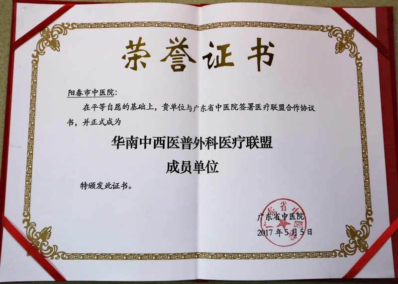 华南中西医普通外科医疗联盟由50余家省内外西医院、中医院和中西医结合医院组成,旨在全面提高广大基层医院普通外科疾病诊疗的临床与研究水平,加快推进普通外科中西医诊治工作和经验推广。我院加入华南中西医普通外科医疗联盟,不但极大地提高了我院普外科的临床治疗水平,提升医院服务档次,还努力实现省内医疗资源共享,让阳春市民足不出户,享受省级医疗水平。