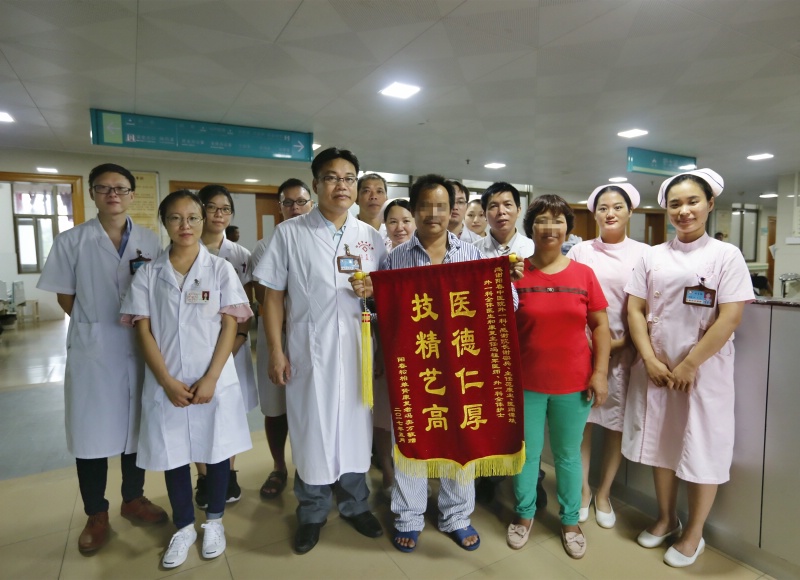 6月22日上午,一位中年男士在其家人的陪同下,专程前往我院外一科将一面写着“医德仁厚,技精艺高”的锦旗亲手送到该科室医务人员手上,以表达他不尽的感激之情。