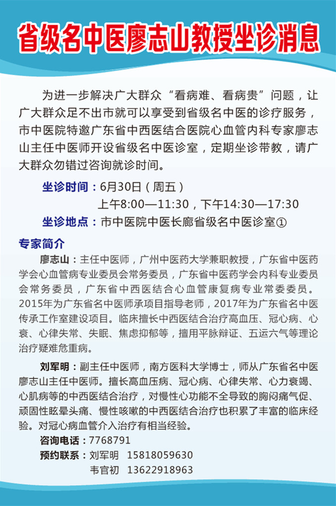 省级名中医廖志山教授坐诊消息