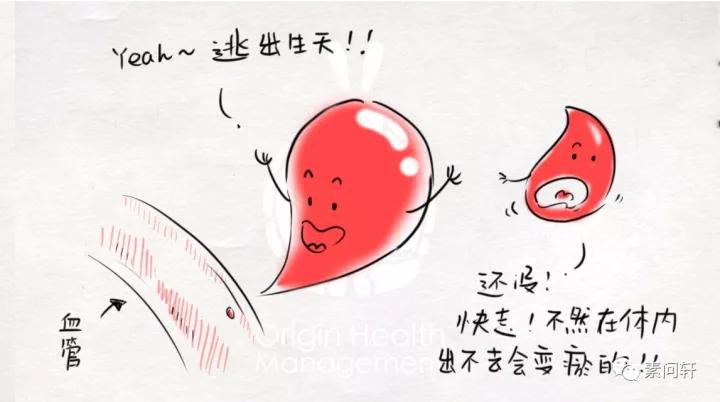 比如摔了一跤,磕痛了,腿上出现了一块青紫的乌青,这就是瘀血的表现。瘀血是病理产物,凡是离开血管的血,积存在体内,或血运行不畅,阻滞于血管及脏腑内的血液,都称为瘀血。
